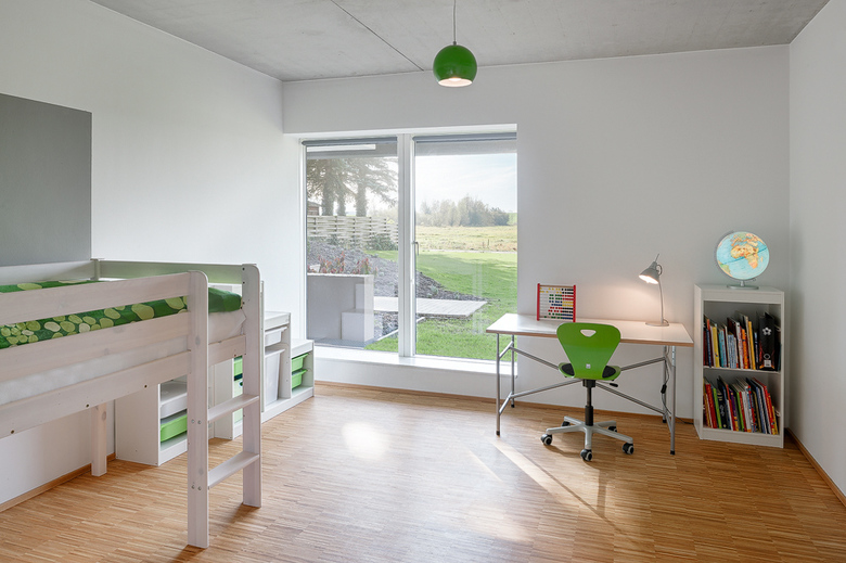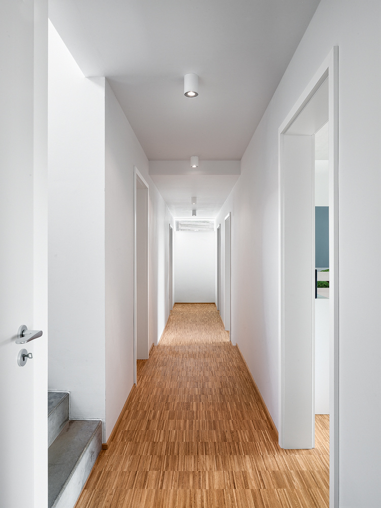 Das durch Teilung entstandene Grundstück bietet Platz für ein kleines Haus am Hang. Der Neubau fügt sich ein in die Zeile der vorhandenen eingeschossigen Bebauung, die den Rand des Ortes Heiligendorf einfasst. Der traditionelle Wohngrundriss ist hier auf den Kopf gestellt: das oberste Geschoss mit Eingang, Wohn- und Essräumen öffnet sich mit Weitblick von der großen Terrasse oberhalb des Gartens. Die Schlafräume und Kinderzimmer befinden sich im Geschoss darunter. So entsteht eine Spielloggia mit einem ebenerdigen Zugang in den Garten. Auch der überdachte PKW Stellplatz genießt den Ausblick in die Auenlandschaft.