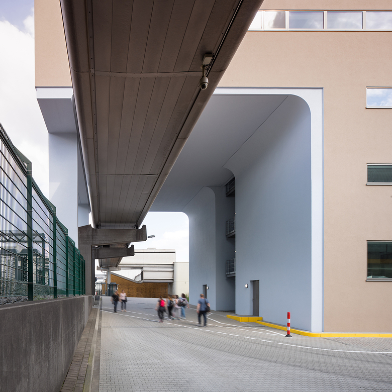 Aus der Notwendigkeit des begrenzten Bauplatzes und der zu erhaltenden Verkehrswege entwickelte aib einen neuen Ort mit hoher baulicher und räumlicher Qualität. Die großzügige Durchfahrtshalle wird von Hohlkehlen charakterisiert, deren Gestaltung die Formensprache bestehender Bauteile aufnimmt. Auch die neue Fluchttreppe wurde gestalterisch eingebunden und im Gebäudevolumen „ausgestanzt“. Die eigentliche Aufgabe einer funktionalen Erweiterung des Bestandes führte auf diese Weise zu einer Aufwertung des Standortes am Rande des Werksgeländes.