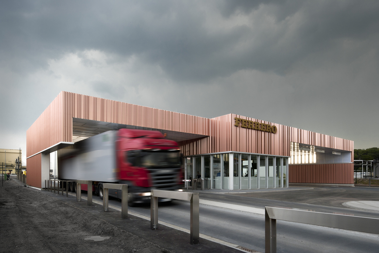 Die Gestaltung des Werkstors basiert auf der "Box", dem einfachen, blechverkleideten Quader als gängigem Grundmaterial der Industriebaupraxis. In fünf Schritten erfolgt die Manipulation dieses Grundmaterials zu einer sichtbaren Architektur. Diese Manipulationen folgen der Idee von "Kern" und "Hülle". Als Hülle, die architektonische Entsprechung des Themas Verpackung in der Produktwelt von Ferrero, werden die umfassenden Flächen durch eine eigens entworfene Aluwelle in Hellkupfer definiert. Das Innere des Durchfahrtsraumes ist als hell erleuchteter räumlicher Kern aus Glas/Makrolon und gebürstetem Aluminium gestaltet und steht für das Thema Sauberkeit in der Produktion von Nahrungs- und Genussmitteln.