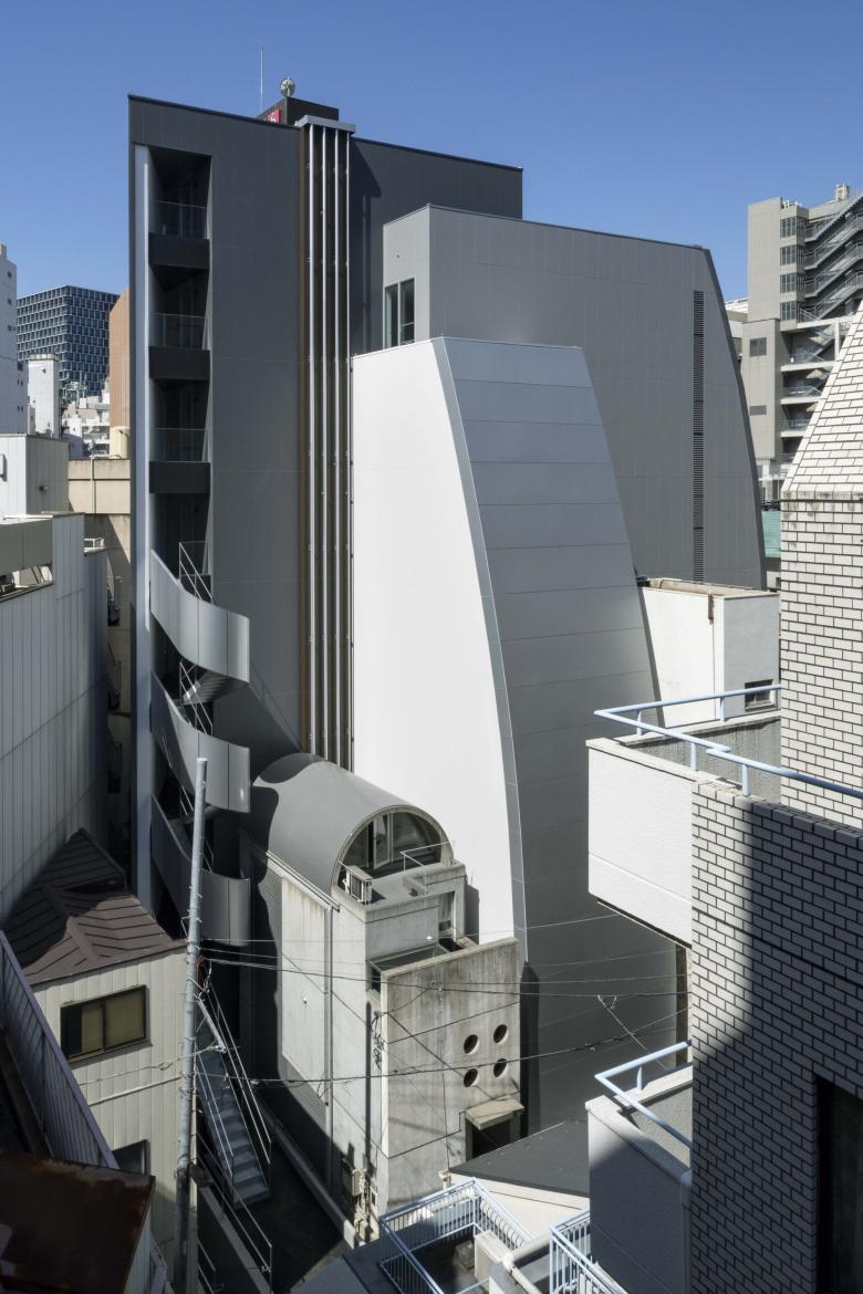 また、変形敷地と斜線制限に合わせて分解したその他のボリュームや、避難階段・バルコニー・設備配管などの必要機能は、音楽会社の自社ビルを表象すべく、様々な楽器の一部に見立て、最大容積を確保しながら再統合。メッシュのかかった正面ファサードには「街に音楽を発信するスピーカー」というもう一つの意味を与え、それ自身が大きなメディアでもある建築の記号性に改めて期待している。