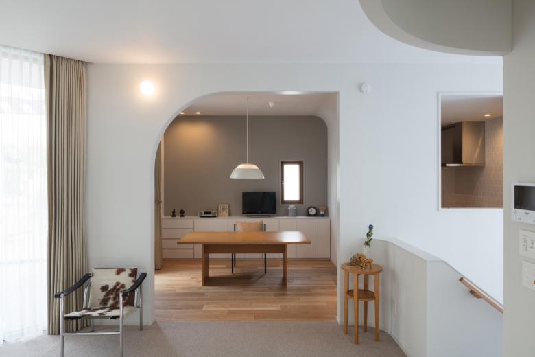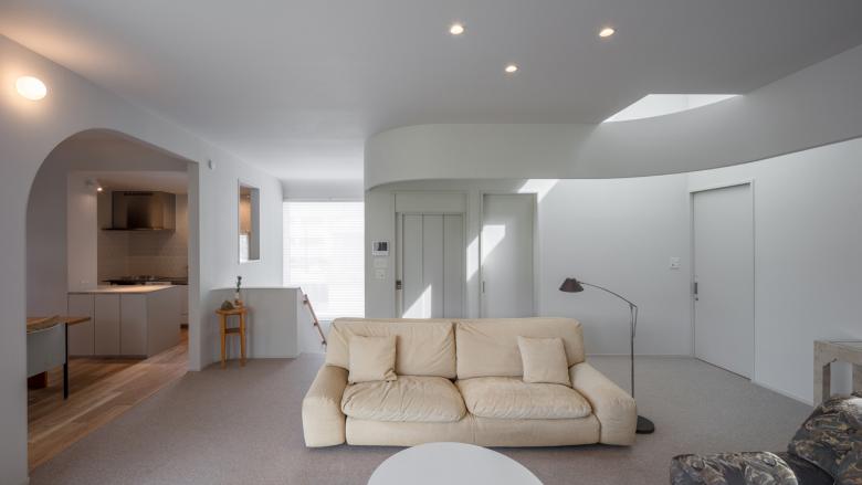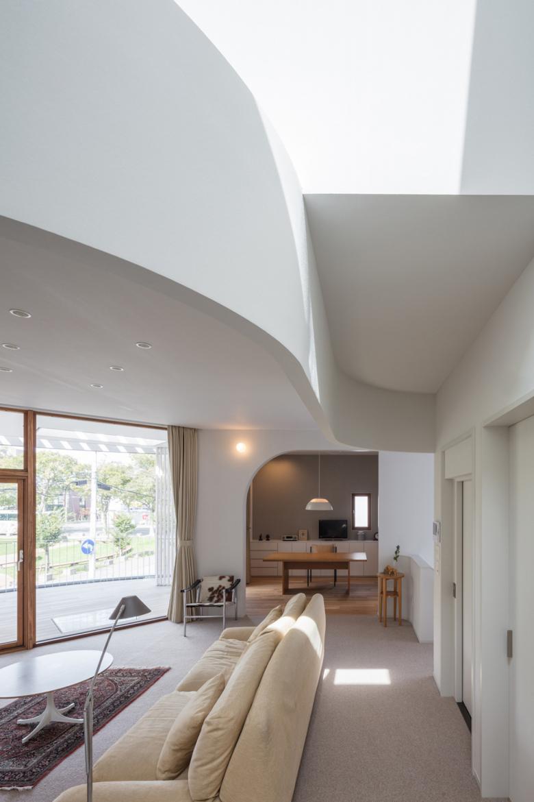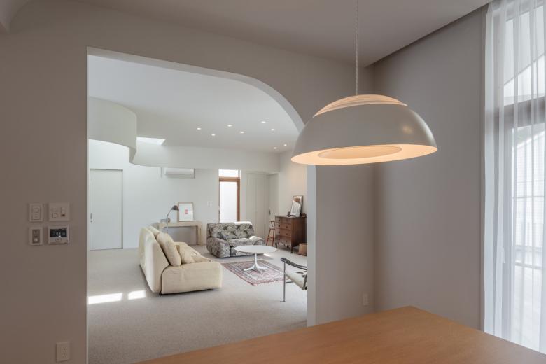 This "curvature" motif, which gives the house a unique expression, also plays a role of implying functional boundaries and people's flow lines, repeatedly appearing in various exterior and interior scenes.