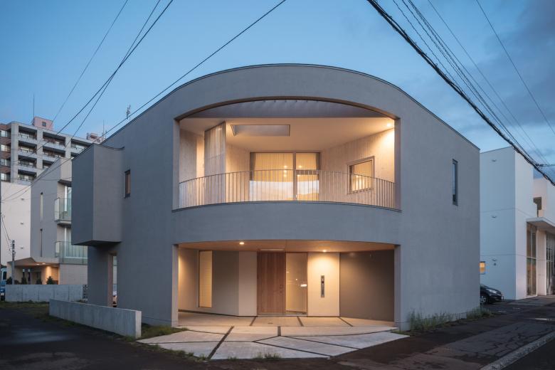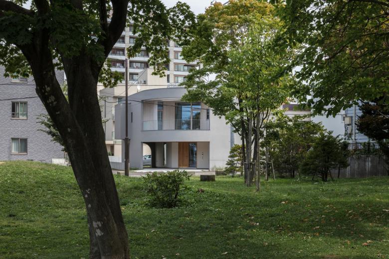 This house is located near a historical park in the city of Sapporo. It is one of the regional characteristics of Sapporo that people often move by car rather than public transport. Yet, the road in front of the house is one-way only, so entrance to the garage and turning direction of the client’s car would be limited. To facilitate car movement, we adopted the shape of the house to the radius which car turning movements would need.