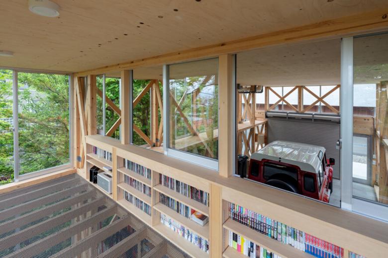 The semi-subterranean bedrooms are placed in a location that avoids the existing trees on the site, and the RC slab ceiling is used to ensure access to the house from the road. On the other hand, in order to secure a distant view, it was necessary to place the living room space at a level 4.5m higher than the RC slab, taking into consideration the topography of the surrounding site, the height of the neighboring houses, and the location of tall trees. In other words, it is as if one volume of the house is separated from the others. The large "empty space" between the houses was physically and structurally necessary to fulfill the three aforementioned requirements, but from a construction cost perspective, it was also desired to be "empty". Therefore, we wanted to create a place where scenery and life intermingle by using a part of the structural frame exposed in the "empty space" as a shelf and covering the outside with a simple non-insulated sash to function as a "storage space for show. This is an attempt to increase the value of the "empty space" while keeping costs down. While this space literally has the practical function of storing various things, it also plays the role of "visualizing" the lifestyle and personality of the residents through their things, and the information that seeps out of the "empty space" becomes an opportunity for the residents to connect with their neighbors.