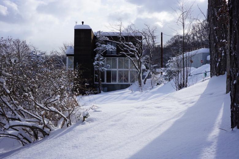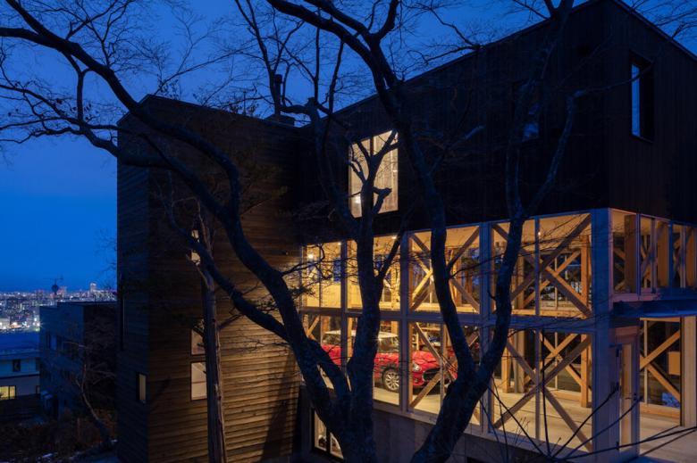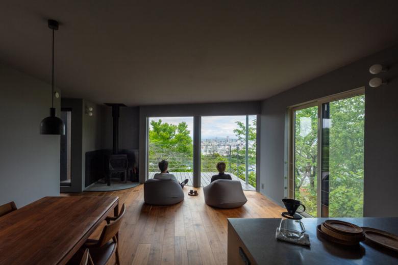 The site overlooking the center of Sapporo is located almost at the top of a residential area spreading out like a hill at the foot of Mt. The client, a design firm, had three clear requests. The first was to preserve the existing trees on the site as much as possible. The second was to provide easy access for people, vehicles, and heavy equipment to the house from the front road on the south side, which is about 2.5 meters higher than the site level. Third, the house should enjoy a distant view of the city center and the Ishikari Mountains to the north.
