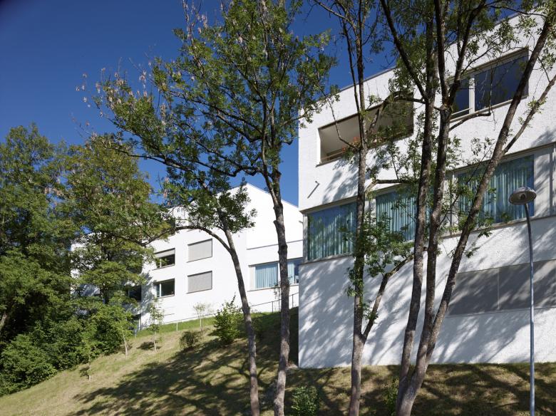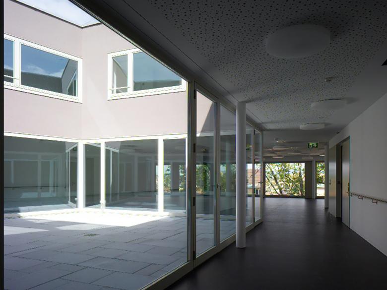 Die vier Pflegewohngruppen sind je um zwei Lichthöfe so angeordnet, dass spannende Sichtbezüge unter den einzelnen Abteilungen entstehen. Sie sind in ihren untersten Geschossen betretbar - der Osthof dient den Pflegewohngruppen, der Westhof der Cafeteria als geschützter Aussenbereich. Die Erschliessungsgänge der Pflegewohngruppen werden über die Höfe belichtet und führen in die zentralen Wohn- und Essräume, von wo aus man den herrlichen Blick auf die Stadt Bern geniesst.