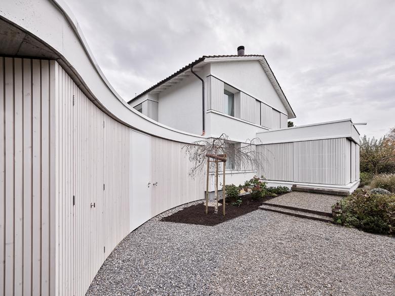 Der Erweiterungsbau lehnt sich an die Architektur-sprache des Bestandes- und Erweiterungsbaus an und zeichnet in seiner organischen Form die Struktur des bestehenden Garten's nach. Trotz sichbarer Geschichte des Hauses sollen sich die zwei Erweiterungsbauten zusammen mit dem ursprünglichen Bau zu einem Ganzen verbinden.