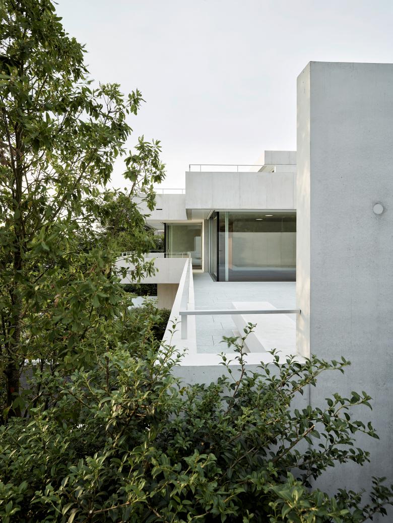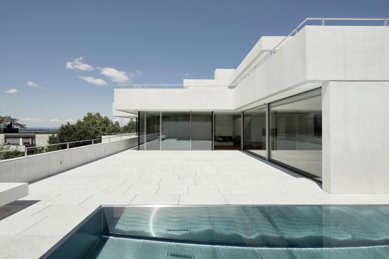 Brüstungen wurden komplett ersetzt und so verändert, dass sämtliche Fenster raumhoch ausgebildet und vor allen Räumen unterschiedlich dimensionierte Terrassen angeboten werden konnten. Das Haus tritt nun mit einer komplett neuen Fassade in Erscheinung, die jedoch die ursprüngliche Fassadenabwicklung nachzeichnet.