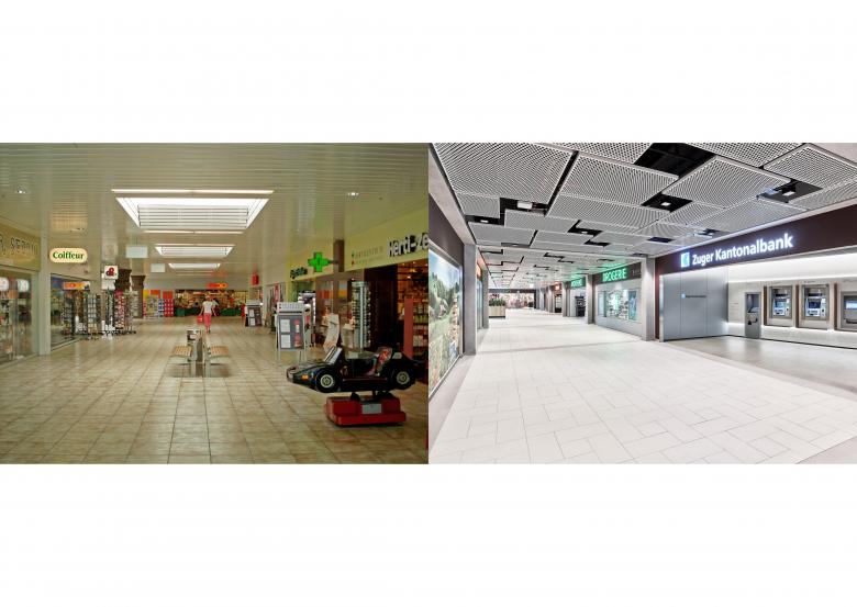 Die Ladenstrasse dient neben der Erschliessung der Geschäfte als öffentliches Trottoir. Die bestehende Tragstruktur (Stützenraster 7.5 x 8.5m) ist in Form von Stützen, Deckenträgern und stützenverbindenden Bodenintarsien ablesbar. Der Bodenbelag ist steinig, z.B. Hartbeton mit farblich abgesetzten Intarsien. Die Lage der Ladenfronten wird durch eine Schürze (Werbeträger) aus beschichtetem Stahlblech markiert. Die Metallabhangdecke mit quadratischem Raster z.B. Cellio, Armstrong wird von betonfarbig gespachtelten Deckenelementen gerahmt. Die Tragstruktur der Deckenelemente bildet die bestehende Struktur ab.