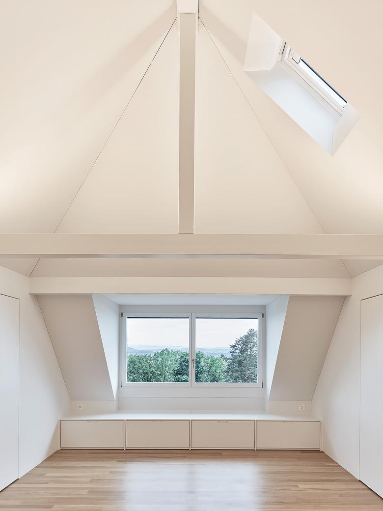 Der bis anhin mit einer kleinen Wohnung und diversen Stauräumen versehene Dachraum wurde gänzlich ausgeräumt und neu zu einem eigenständigen Wohnraum mit kleiner Küche und Alkoven umgebaut.