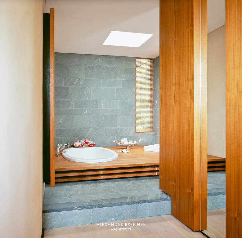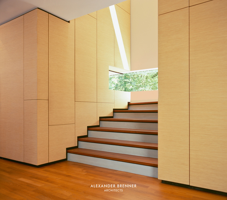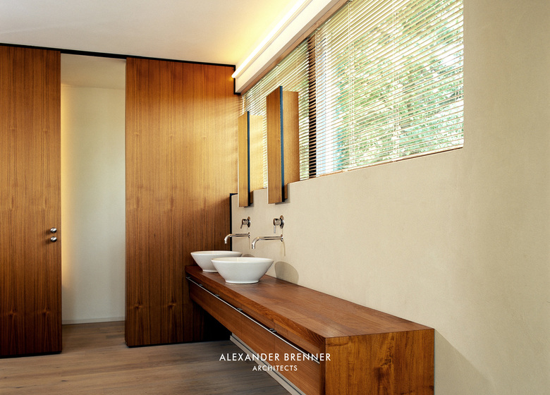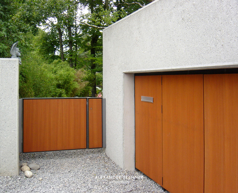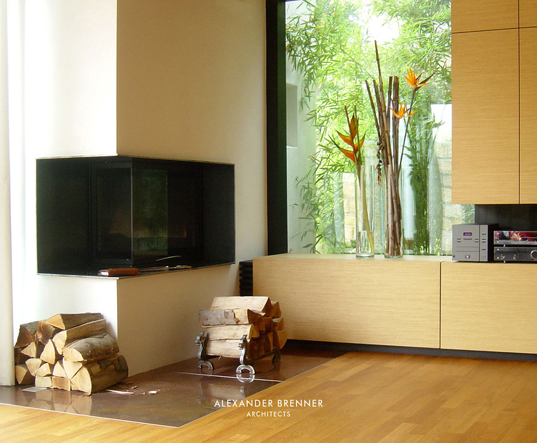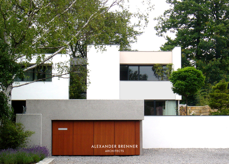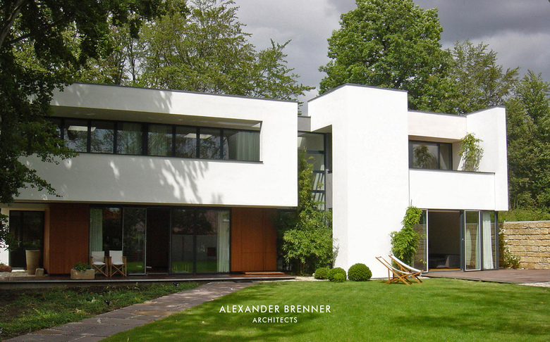 Das Grundstück liegt am Rand einer kleinteiligen Einfamilienhaus-Bebauung. Auf der Ostseite schließt großflächiger Geschosswohnungsbau an. Der klare und kräftige Baukörper vermittelt zwischen den unterschiedlichen Bauformen und Maßstäben. Im Norden konnte alter Baumbestand erhalten werden. Wunsch der Bauherren war ein modernes, helles und lichtdurchflutetes Haus, das nach baubiologischen Kriterien erbaut werden, doch in seiner Erscheinung nicht dem Bild eines klassischen „Öko-Hauses“ entsprechen sollte. Das Haus wird über einen geschwungenen Weg von der Südseite erschlossen. Im Erdgeschoss sind alle Gemeinschaftsräume der Familie angeordnet, während sich das Obergeschoss zu beiden Seiten einer vertikalen Glasfuge in zwei Baukörper gliedert – auf der einen Seite der Halle mit der Galerie befindet sich das Kinderhaus, auf der anderen Seite, in einem vortretenden Baukörper, das Elternhaus. Anders als die meisten anderen Bauten des Architekten wurde dieses Haus in Holzrahmenbauweise erstellt. Lehmziegel in den Decken dienen als Speicher. Die Wände wurden ebenfalls in diesem Material ausgeführt und mit einem Lehmputz versehen. Auch alle anderen verwendeten Materialien wurden nach baubiologischen Gesichtspunkten ausgewählt. Die Beheizung erfolgt über Geothermie. Eine kontrollierte Be- und Entlüftung mit Wärmerückgewinnung trägt zur Nachhaltigkeit des Gesamtkonzepts bei.