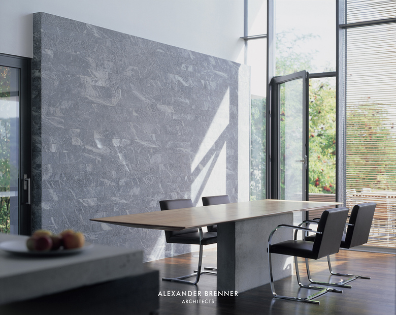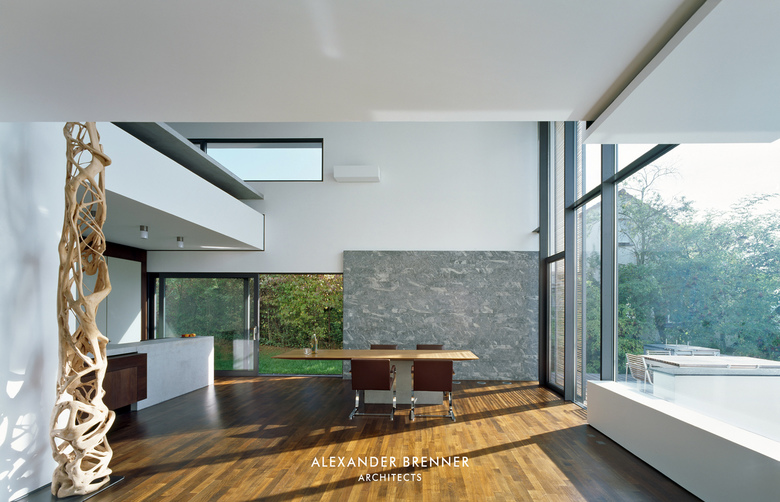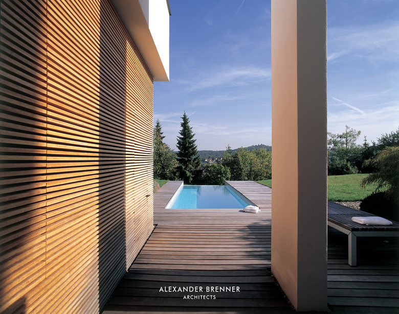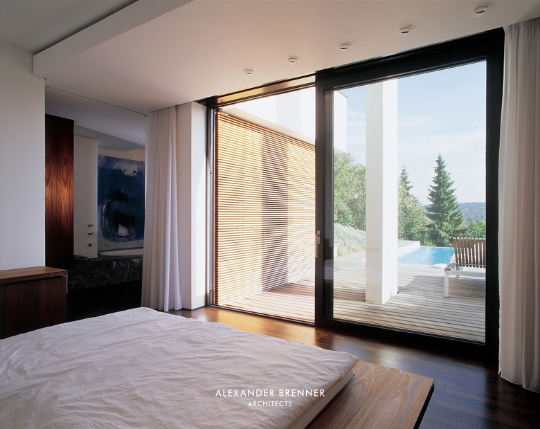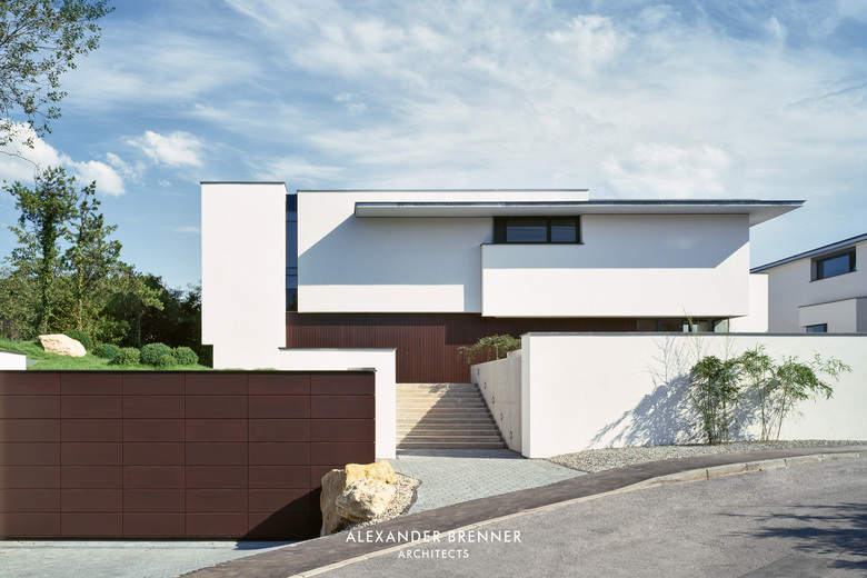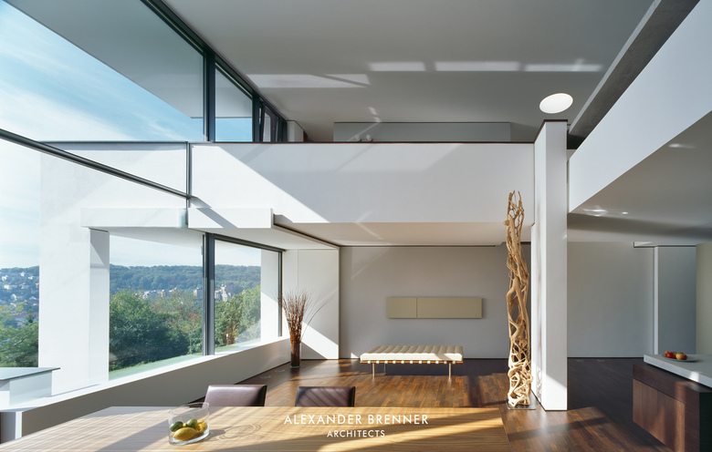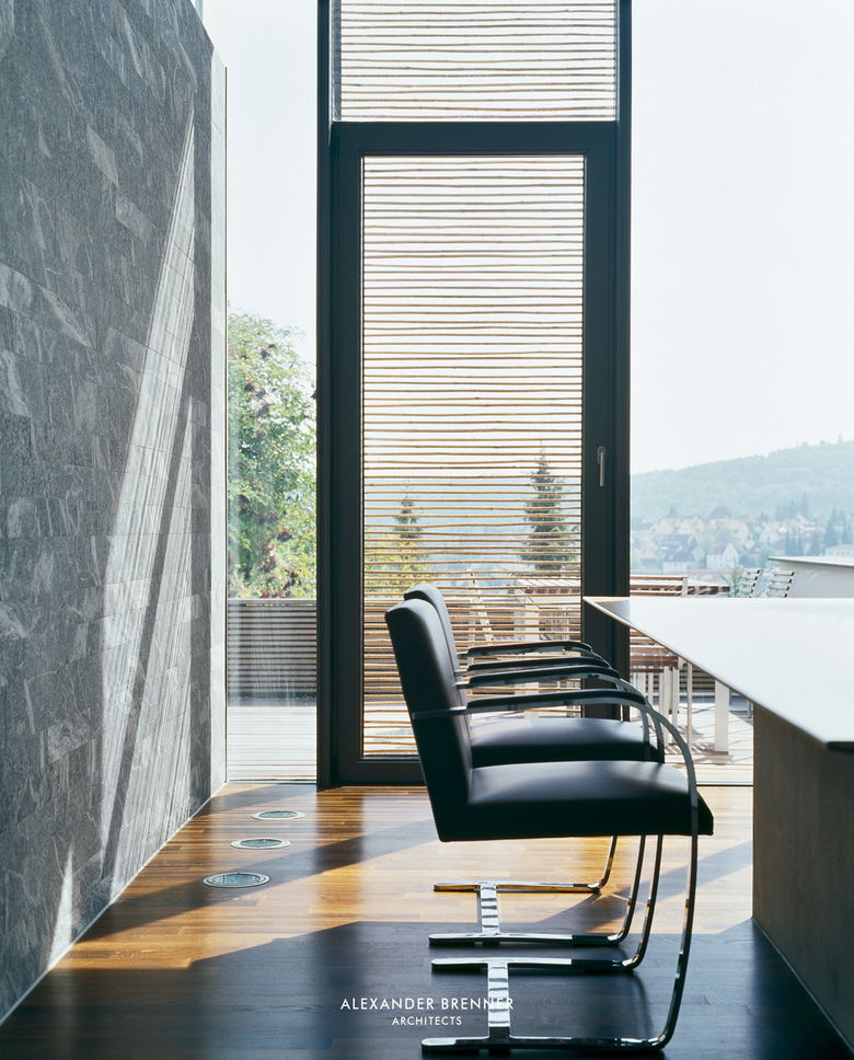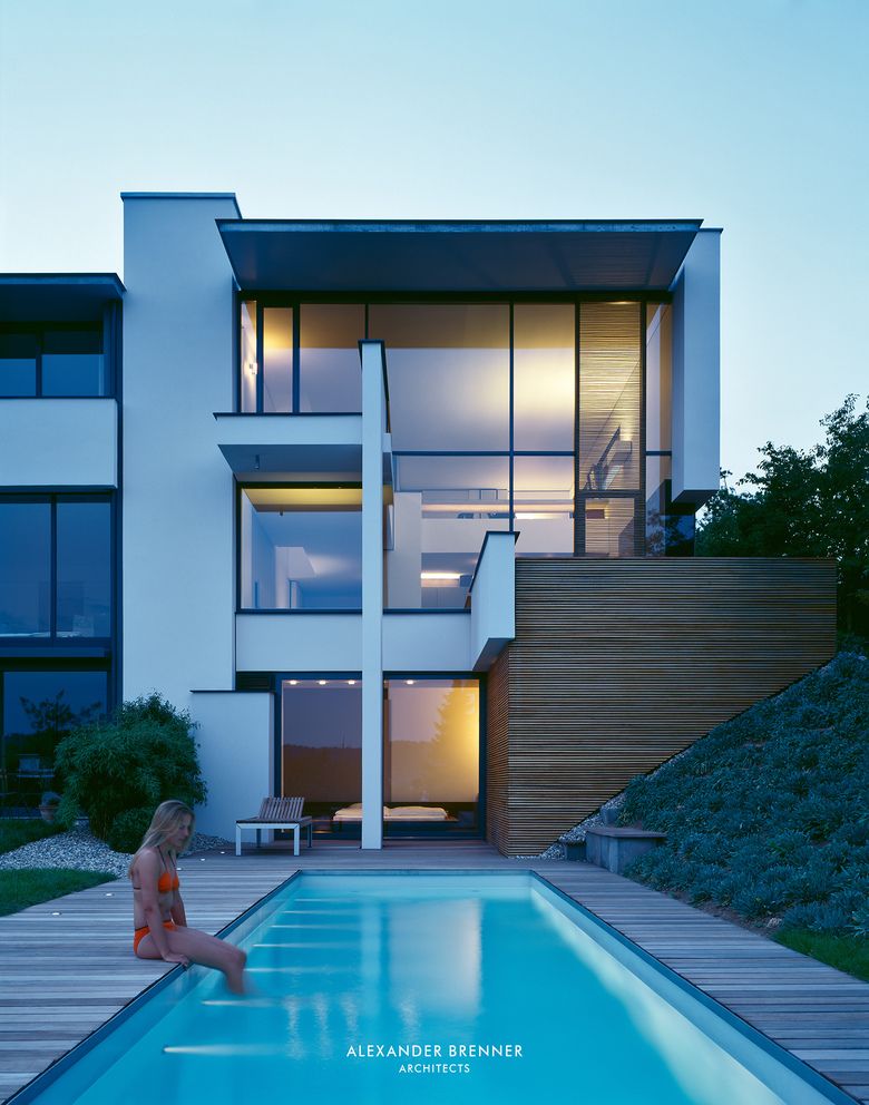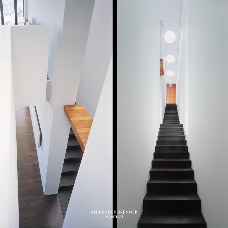 Zur Straßenseite erscheint die aus Kuben und Wandscheiben gegliederte Nordfassade weitgehend geschlossen und erweckt den Eindruck einer einzelnen, freistehenden Villa. Hinter der gemeinsamen Fassade entstanden jedoch zwei Stadtvillen, deren unterschiedliche Grundrissdispositionen den Bedürfnissen und Lebensweisen der jeweiligen Bewohner folgen. Auf annähernd gleicher Grundfläche ist die westliche Haushälfte durch ihr Mehrraumkonzept für eine Familiennutzung ausgelegt, während die östliche Hälfte einem offenen, fließenden Raumkonzept folgt. Eine großzügige Treppe führt von der Straße aus über zwölf Stufen hoch zur Eingangsebene. Die Eingänge sind unsichtbar in die Flächenstruktur des Erdgeschosses integriert. Die östliche Haushälfte verfügt zudem über einen direkten Zugang über die Garage. An einem verglasten Weinkeller vorbei gelangt man hier durch einen 14 Meter langen Ankleideraum mit Schrankeinbauten zur Badelandschaft und dem Schlafzimmer. Vor dem Schlafzimmer liegt der Pool, durch Solarkollektoren auf dem Dach ganzjährig erwärmt. Eine einläufige, von oben belichtete Treppe erschließt alle drei Ebenen des Hauses. Im Erdgeschoss ist ein großzügiger zweigeschossiger Raum, mit einer freistehenden Küchentheke aus Beton und mit einem ebenfalls vom Architekten entworfenen Esstisch, auf dessen betoniertem Sockel eine weit auskragende, von unten beleuchtete Holzplatte schwebt. Von der Glasfassade auf der südlichen Aussichtsseite werden der Wohnbereich sowie die Loungezone und der Arbeitsplatz auf der Galerie mit Licht durchflutet. Bei Dunkelheit spielen die Lichter des Innenraums auf der Glasfassade und mischen sich mit den Reflektionen der Stadt, der Landschaft und des Pools.