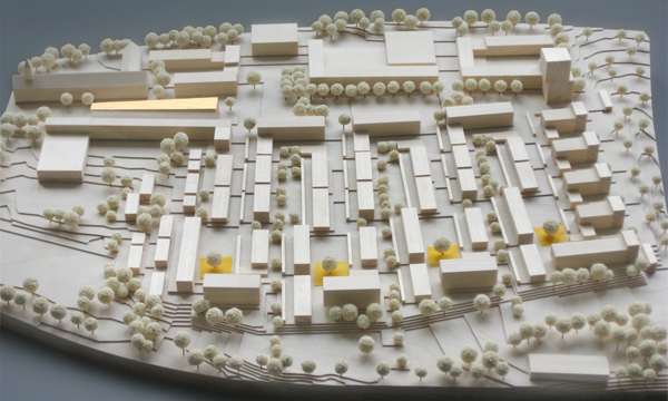 Kerngedanke unseres Entwurfs ist es zum Einen, dem Quartier einen direkten Bezug zur Weite des nördlich anschliessenden Landschaftsraums zu geben: Dank der speziellen Quartierstruktur kann man von jeder Wohnung ins Grüne gelangen, ohne eine einzige Fahrbahn zu queren. Zum Anderen entsteht an der stark befahrenen Strasse im Westen ein unverwechselbares Quartierzentrum mit einer gewissen Urbanität - ein grosszügiger öffentlicher Anger, geschützt vom Durchgangsverkehr, an den alle publikumsorientierten Funktionen im Quartier andocken: Schule, Discounter sowie kleinere Läden und Praxen.