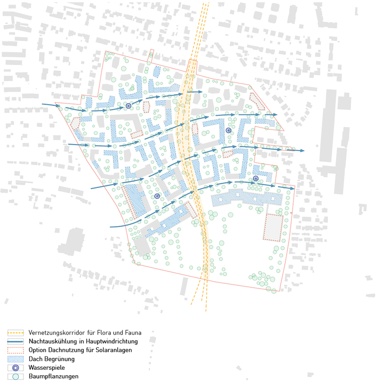 Wo immer sinnvoll, ergänzen Dachgärten das Freiraumangebot. Alle Dächer dienen der Retention des Regenwassers und der Kühlung im Sommer (Stichwort