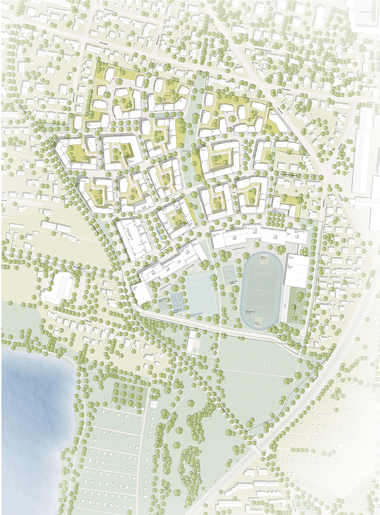Kern unseres Vorschlags ist das Ziel, das neue Quartier in den Kontext von Feldmoching einzubinden und die geforderte Dichte mit möglichst niedrigen Gebäuden zu erreichen.