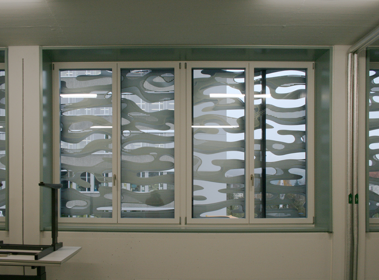 Ausgehend von einer Fotografie erarbeiteten wir ein Muster, das wir zusammen mit dem Stoffkünstler Andreas Hurr so bearbeiteten, dass sich ein Grundmuster wie bei Stoffen mittels Rapport unendlich zusammensetzen lässt. Die Farbigkeit und die Spiegelungen der Wasseroberfläche realisieren wir mit einem dreischichtigen Fassadenaufbau, mit 2 Schichten gelaserten Aluminiumblechen, die in einem Abstand von je 10 cm auf die mit einer blauen Folie bedeckten Isolationsschicht montiert werden.