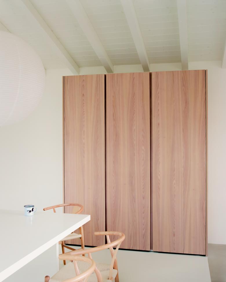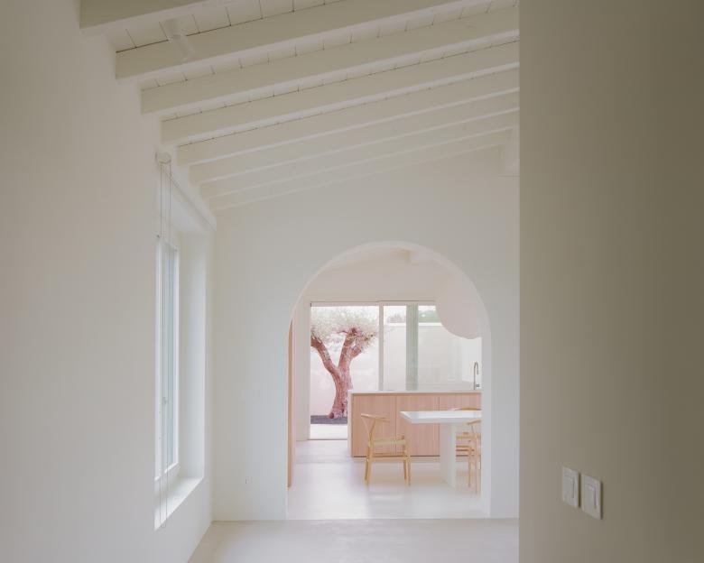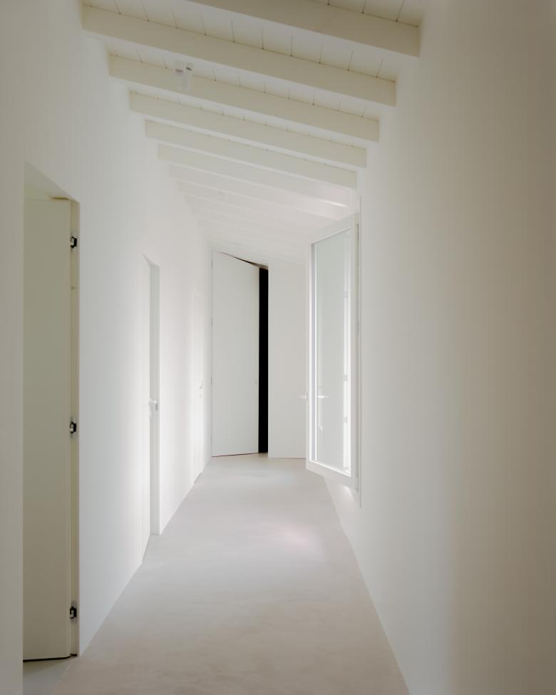 Alla superficie aspra e materica del fabbricato, si contrappone uno spazio interno accogliente e semplice.