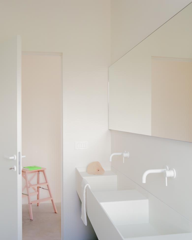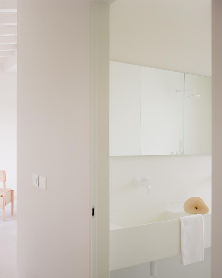 Gli spazi rituali del vivere domestico, instaurano relazioni intime e puntuali con l’esterno e sono organizzati lungo un asse visivo, che è anche percorso, che collega il patio interno della zona giorno alla camera da letto principale.