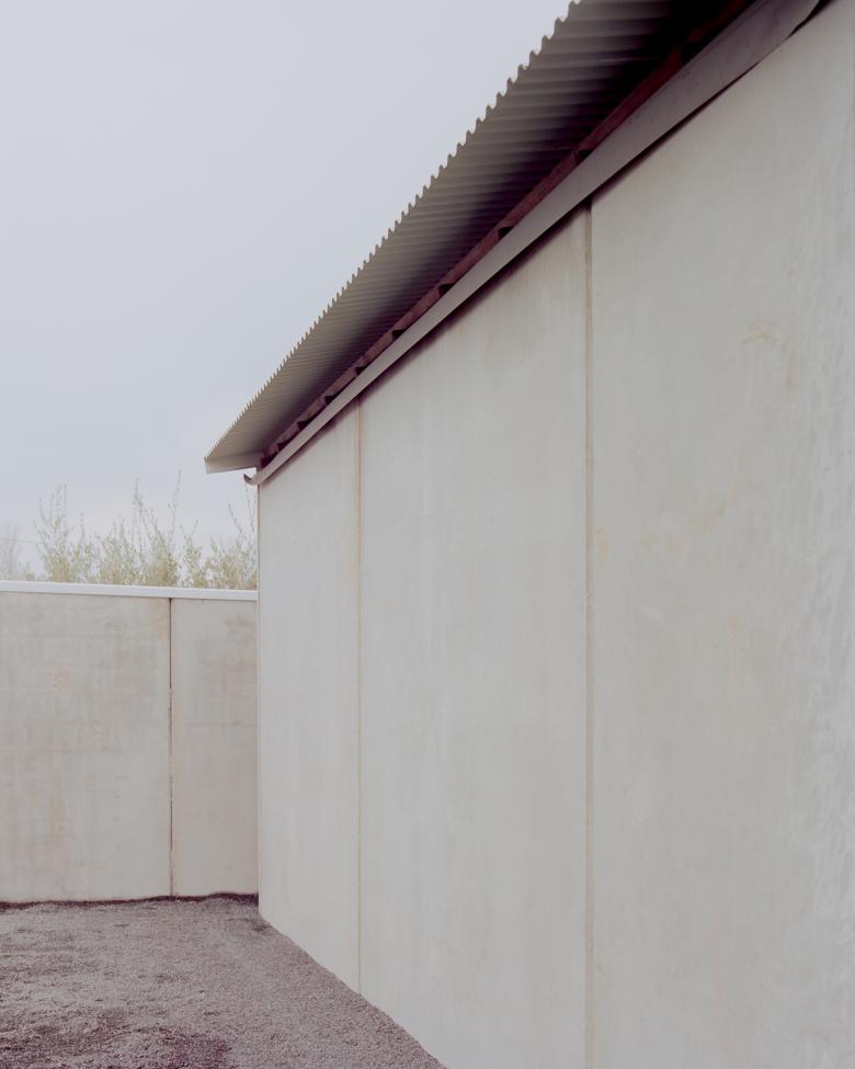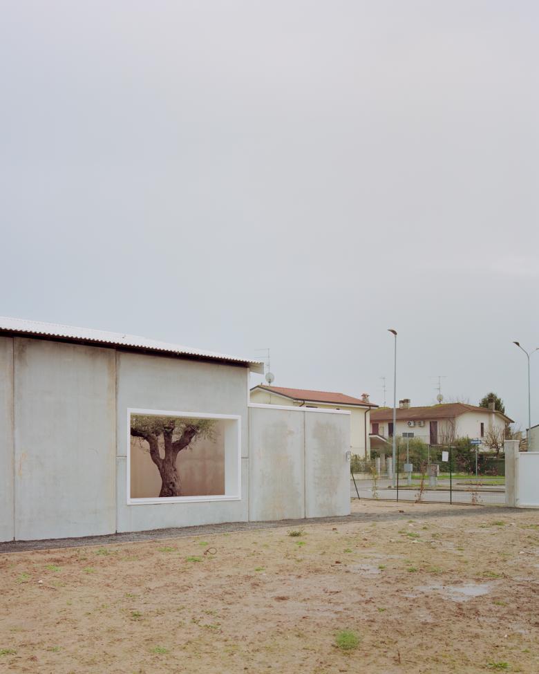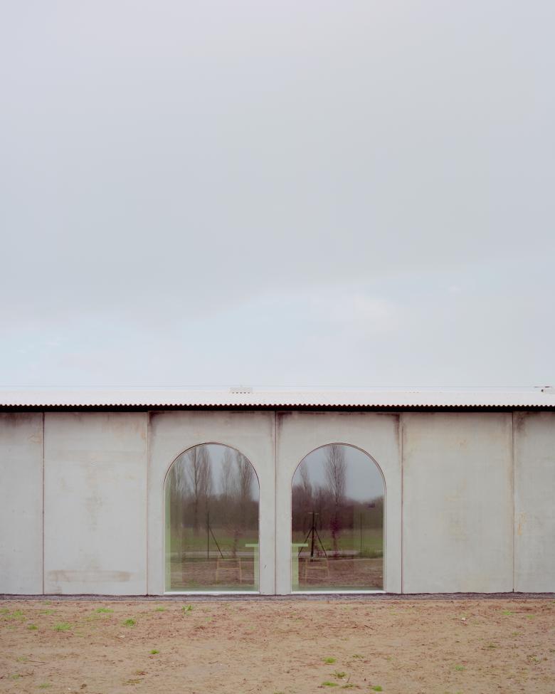 L’ edificio in cemento prefabbricato con copertura in lamiera bianca rinnova la tradizione del paesaggio agrario padano storicamente costituito dalla presenza di volumi elementari caratterizzati da semplici geometrie euclidee.
