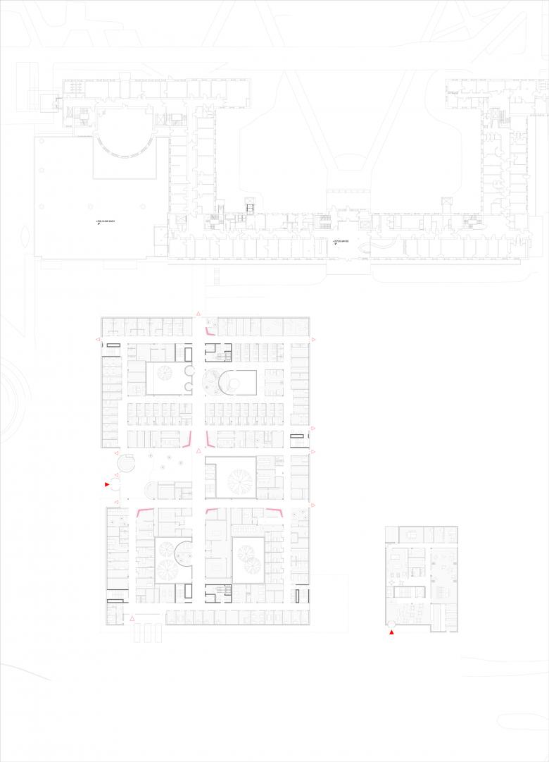 Die Typologie lehnt sich an die historische Entwicklung an, über der kompakten Eingangsebene beginnt im Hauptgeschoss die terrassierte mäanderförmige Ausgestaltung der Baukörper, die Rücksicht auf die angrenzenden Gebäude nimmt. Die zentrale zweigeschossige Eingangshalle mit der künstlerisch gestalteten Lichtdecke empfängt Patient*innen und Besucher*innen von Beginn an mit einer offenen und hellen Atmosphäre. In Kombination mit vielfältigen Blickbeziehungen liefert sie intuitive Orientierbarkeit.