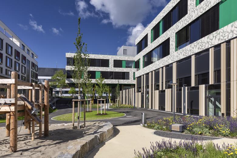 Das Projekt ist einfühlsam und gut durchdacht geplant. Es setzt Patient*innen an erste Stelle, stellt viele Bezüge zwischen Innenraum und der umliegenden Parklandschaft her, und wurde nach den DGNB Gold Nachhaltigkeitsstandards konzipiert. Der gesamte Komplex ist von einem modernen und farbenfrohen Dorfcharakter geprägt. Die Terrassen der Pflegegeschosse und die begrünten Dächer setzen den umliegenden Park in der Klinik fort und bieten weitere Erholungs- und Interaktionsräume. Kinder und Eltern können jederzeit leicht an die frische Luft gelangen – in Höfen, auf Terrassen und Balkonen.