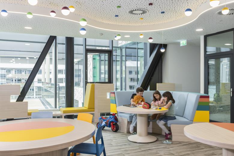 Auf den Pflegeetagen helfen innovative Spielzonen und Rückzugsräume dabei, die Interaktion, die Mobilität und die Entwicklung der Kinder zu stärken und neue Freundschaften zu schließen. In der Familienbibliothek gibt es ausreichend Raum für Entspannung oder zum Lernen während langer Behandlungstage. Eine eigene Elternküche ermöglicht das Kochen und Essen in Gemeinschaft mit der ganzen Familie. Dies hilft vor allem jungen Patient*innen beim Gesundwerden. Für Termin-Patient*innen gibt es anstelle eines klassischen Wartebereichs den Antiwarten-Raum, der Kindern, Jugendlichen und Eltern die nötige Ablenkung und Entlastung bietet. Er hilft Ängste, Anspannung und Aufregung abzubauen und bereitet optimal auf Arztbesuche, Untersuchungen und Behandlungen vor.