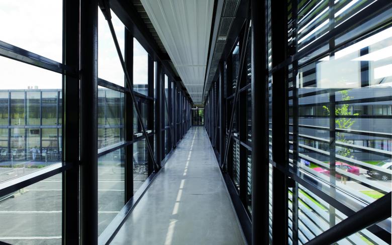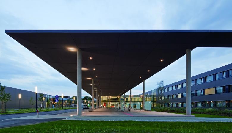 Das Projektteam manifestierte diese Vision einer großzügigen, offenen Architektur bereits im Wettbewerbsentwurf und überzeugte damit Jury und AuftraggeberInnen. Heute bettet sich der 44.000 m2 umfassende flache Bau mit nur zwei Obergeschossen sanft in die Stadtlandschaft Klagenfurts. Wie eine kleine Gartenstadt besticht das Klinikum, das direkt an die Au-Landschaft der Glan angrenzt, durch seine Transparenz und die einladenden grünen Innenhöfe.