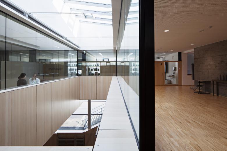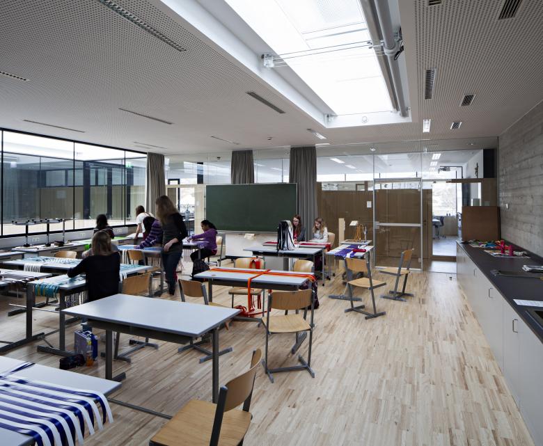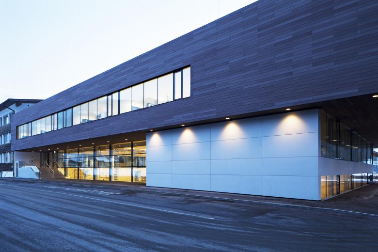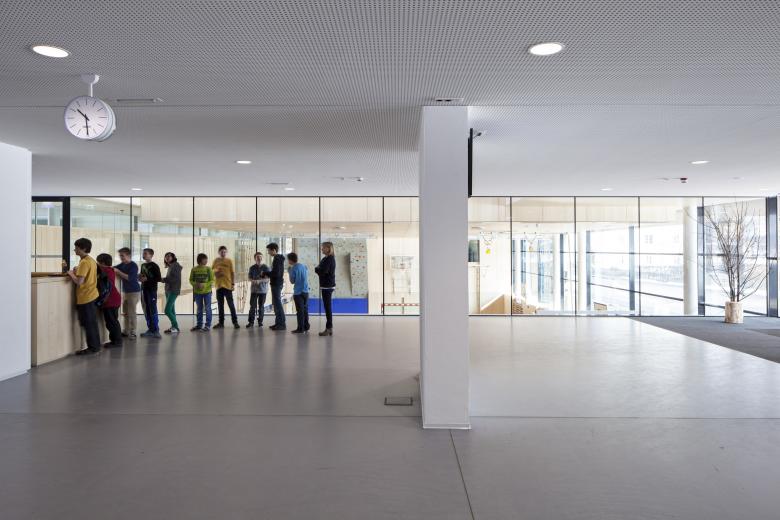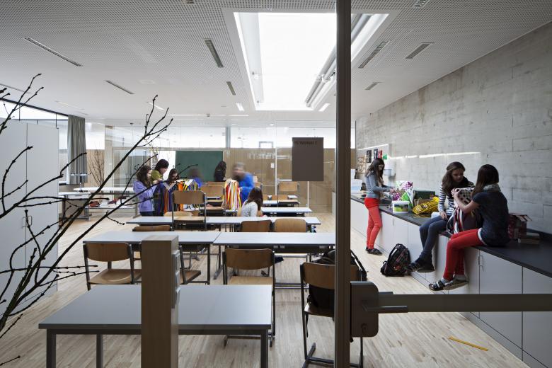 Die reduzierte, aber raffinierte Formensprache lässt das Gebäude von innen nach außen und umgekehrt fließen. Das Foyer heißt BesucherInnen und SchülerInnen willkommen. Ein speziell abgesenkter Turnsaal, eine Panorama-Terrasse, ein Pausenhof in Form eines begehbaren Daches und einige architektonische Überraschungen machen den Besuch des Zentrums zum alltäglichen Erlebnis. Beton, viele Glasflächen und warme Holztöne schaffen dafür einen passenden und nachhaltigen Rahmen.