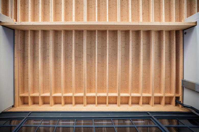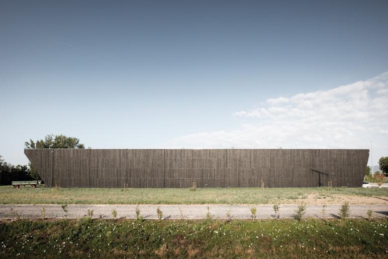 Realisiert wurde ein Holz-System-Leichtbau, dessen schwarze Außenhülle aus Holz durch die Anwendung der jahrtausendealten japanischen Shou-Sugi-Ban-Technik eine verblüffende Ästhetik bekommt: Dabei wird die Oberfläche durch Ankohlen geschützt, was dem Holz eine Art getoasteten Effekt verleiht. Die Hülle umspannt den massiven Innenausbau, der als thermischer Speicher aus Bims-Beton zur Nachhaltigkeit des Gebäudes beiträgt. In Form von markanten Sheds am Dach, die Licht und Luft ins Innere lassen, erinnert der Entwurf an die zeitgenössische Version eines japanischen Teepavillons, der hier in der Pfalz auf die Formensprache der Wiener Moderne trifft.