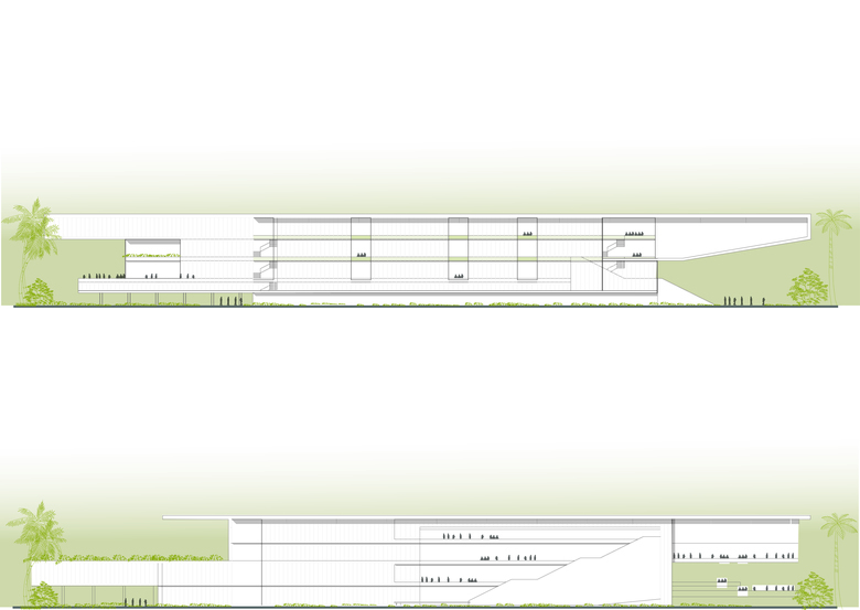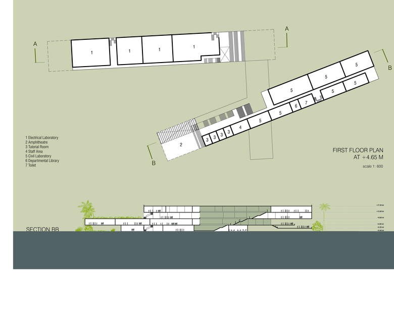The buildings were drawn out as linear bars placed on the wetlands, with a series of open spaces along the length which opened up into public spaces and break out areas for common usage by the students. A series of open and semi-open spaces link the buildings while maintaining a constant connection with the outside. The elevation reflects the buildings orientation and responds to the climatic considerations of Kerala.