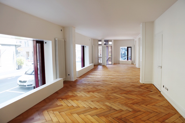 Das Sockelgeschoss wurde mit einem dunkelfarbenen, strukturierten Deckputz ausgezeichnet. Die Struktur strahlt eine gewisse Sinnlichkeit aus. Feldartig aufgeteilt rhythmisiert der Putz im Zusammenspiel mit den Schaufenstern die Fassade.