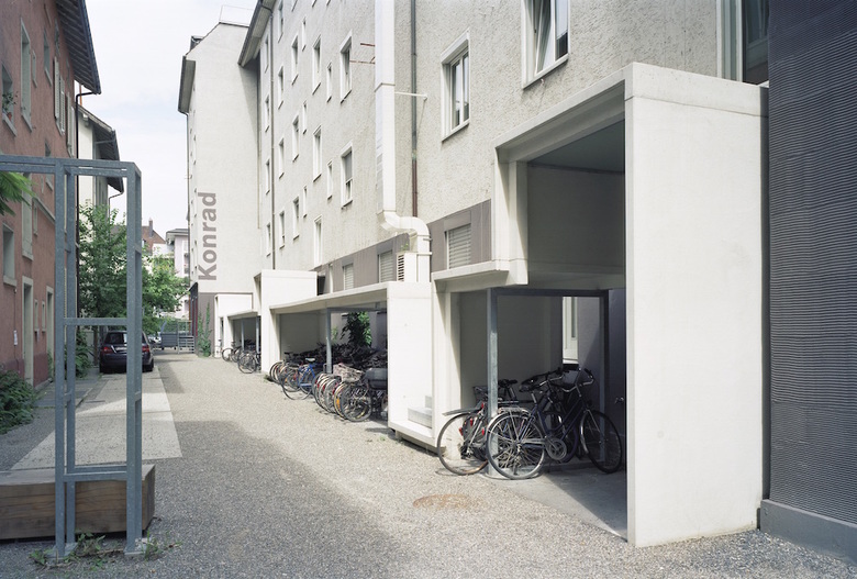 Die Häuser erhalten auf der Hofseite ein durchlaufendes Betonband vorgesetzt: Einmal als Vordach für die Hauszugänge, einmal Zugangsrampe für die Gewerbebetriebe, zwischendurch Schutzdach für die Veloabstellplätze.