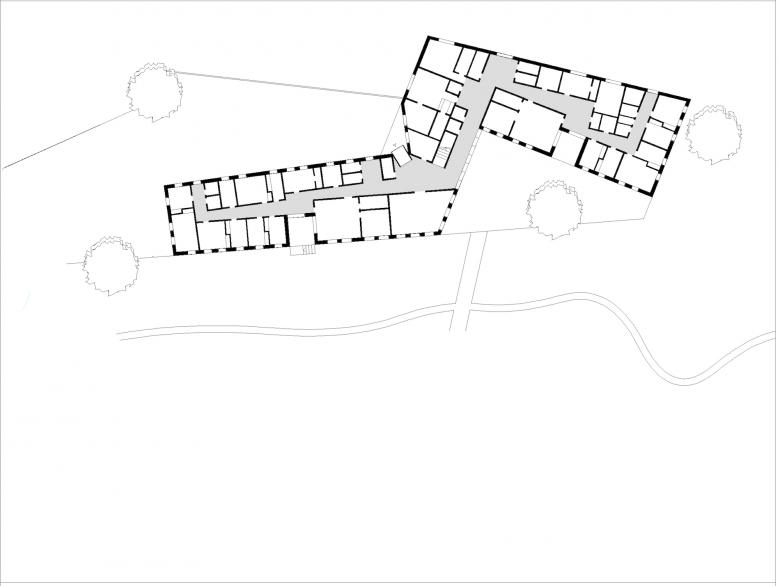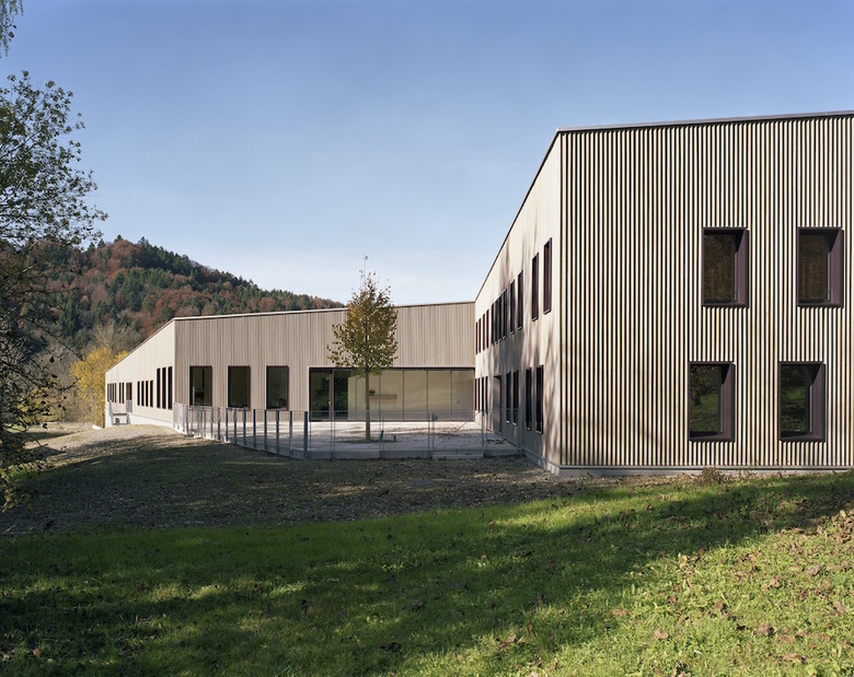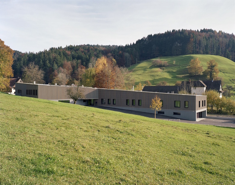 Die Topographie und die vorhandenen Landschaftselemente prägen die Setzung des neuen Baukörpers wie auch seine Massstäblichkeit. Das leicht ansteigende, z-förmige Gebäude vermittelt zwischen Bach und Berg. Das geknickte, niedere Volumen nimmt sich vornehm zurück und schmiegt sich in die Landschaft ein.