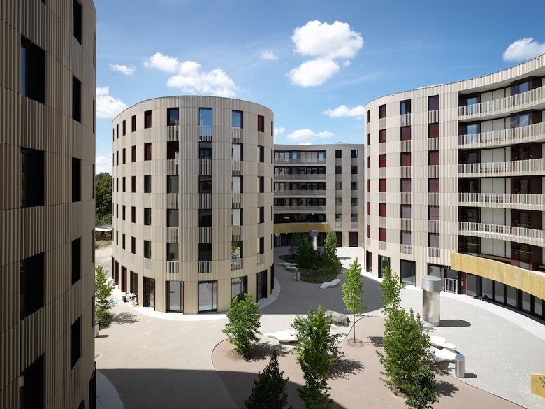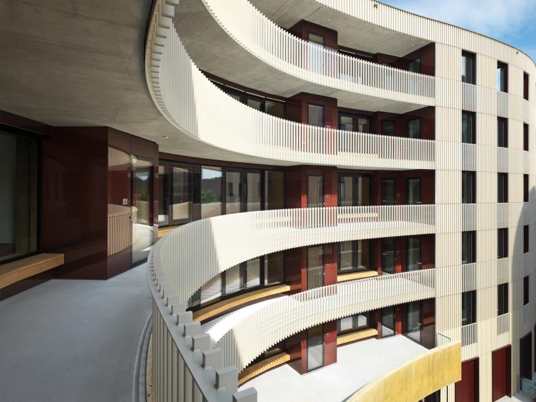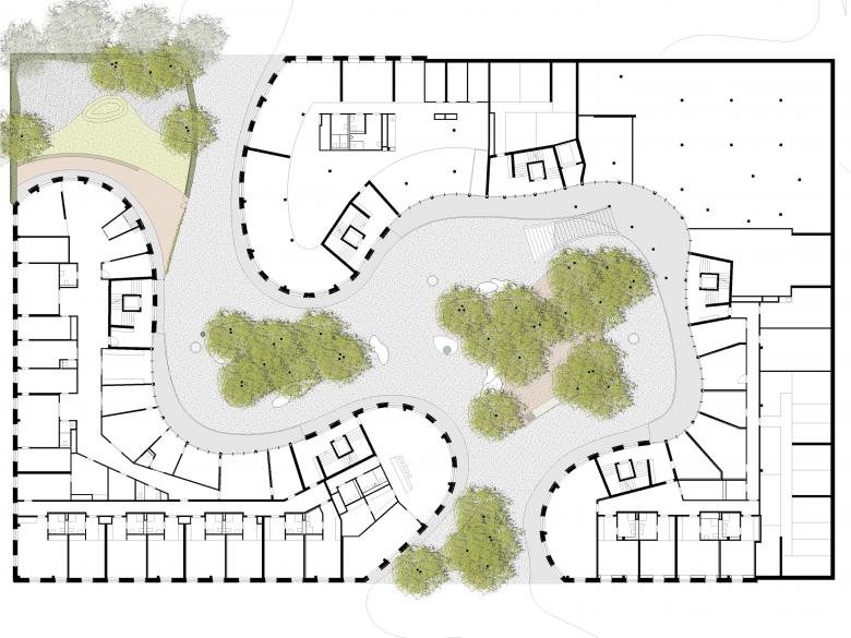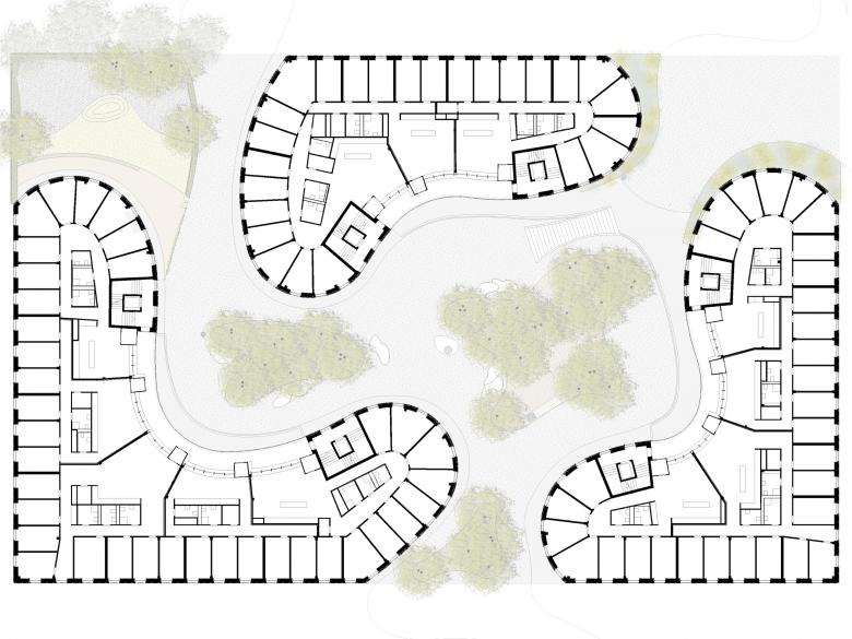 Die Anordnung der Bauten und die Ausformulierung der Gebäudegeometrien akzentuieren den Wechsel zwischen dem äusseren Umfeld und dem Inneren. Dies provoziert auch einen Wechsel in der Wahrnehmung: Vom Instituti-onellen zum zu Hause ankommen. Demnach folgen die Fassadenfluchten gegenüber den umliegenden Bauten strikt den Baufeldlinien, innerhalb bewegen sie sich dagegen frei und folgen lediglich der eigenen Konvention - ähnlich wie bei einem Gesellschaftstanz. Die Übergänge sind einladend und fliessend, sie sind potentielle Stellen für baufeldübergreifende Beziehungen sowie zur freien Landschaft.