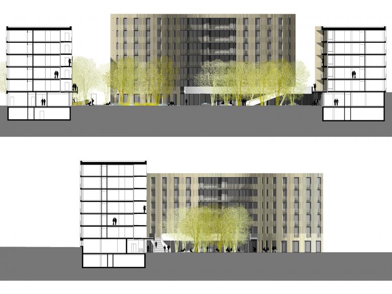 Das vorgegebene Baufeld wird mit je einem Gebäude an den beiden südlichen Ecken besetzt. Das dritte Gebäude legt den nördlichen Rand fest. Sie spannen das Baufeld auf und verankern das erste Puzzleteil im südwestlichen Masterplangebiet von Science City.