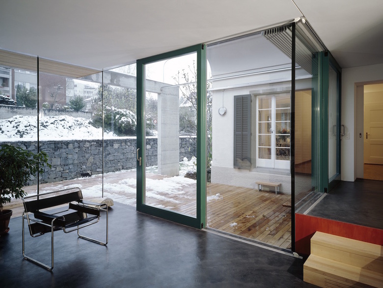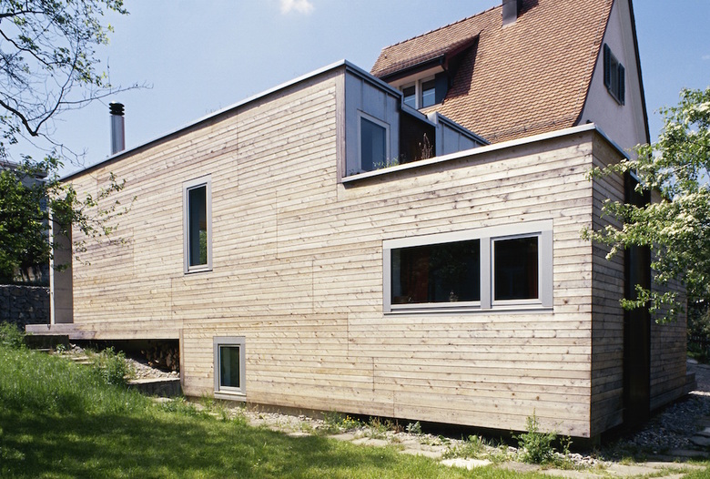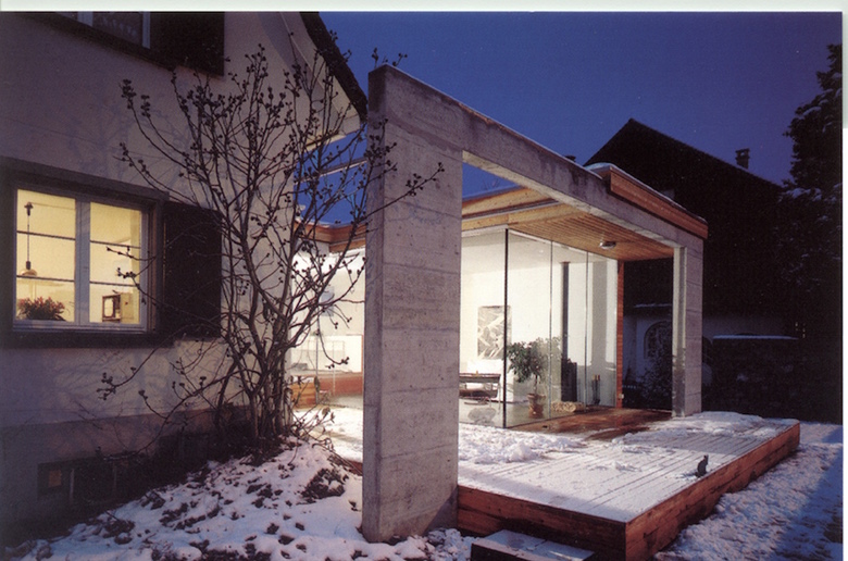Die Wohnhauserweiterung setzt sich aus einem T-förmigen Anbau, der in der Höhe spiralartig abgetreppt ist, und einem kleinen Nebengebäude zusammen. Mit dem bestehenden Haus entsteht eine Neukomposition, die unterschiedliche Aussenräume erzeugt. Im Erdgeschoss bildet die winkelförmige Anordnung einen kleinen Hof, der im Sommer zum Aussenzimmer wird. Hangabwärts entsteht mit dem Nebengebäude, dem bestehenden Haus und dem Anbau ein Spielhof.