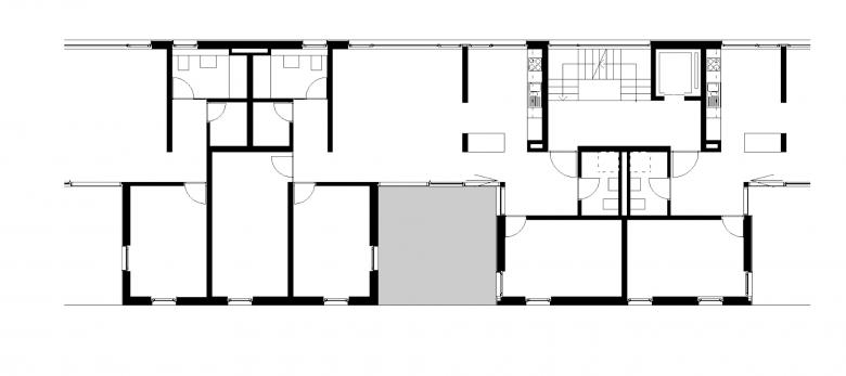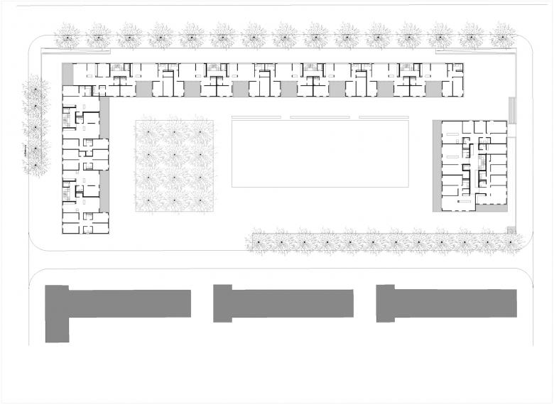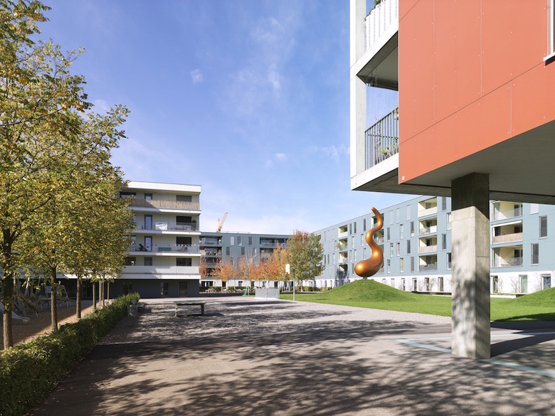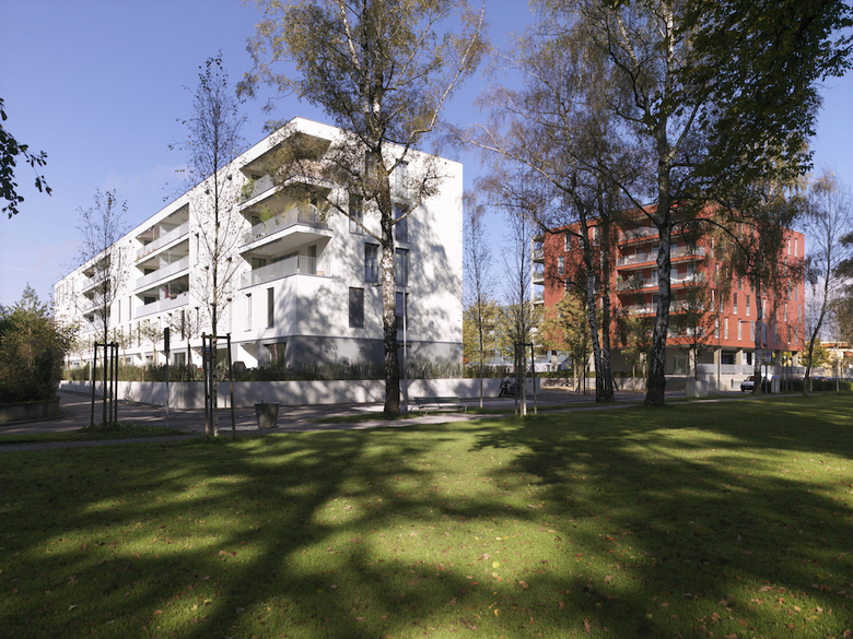 Eingefasste Felder mit Baumgruppen erzeugen Orte unterschiedlicher Charakteren mit abwechslungsreichen Lichtstimmungen. Der neue Winkelbau erhält im langen Schenkel zweigeschossige Gartenwohnungen mit eigenem Sitzplatz. Darüber sind Geschosswohnungen organisiert. Im kurzen Schenkel befinden sich Wohnungen unterschiedlicher Grösse. Diese werden mit gemeinschaftlich genutzten Räumen im Erdgeschoss von einer Hausgemeinschaft selber verwaltet. Kleinwohnungen für Single- und Zweipersonenhaushalte werden im scheibenförmigen Volumen über einen Laubengang erschlossen.