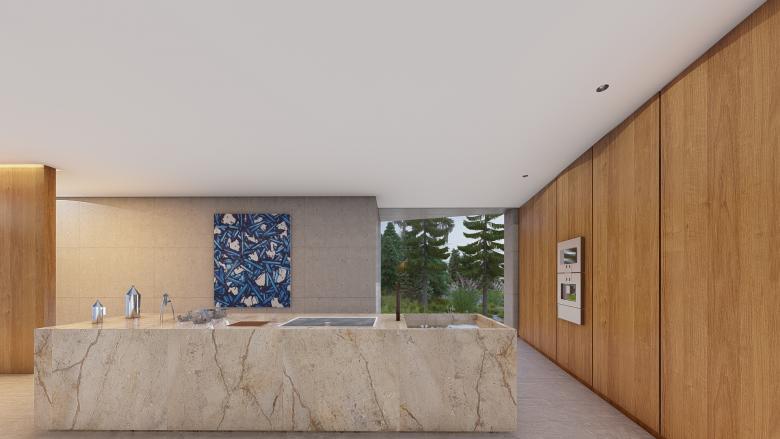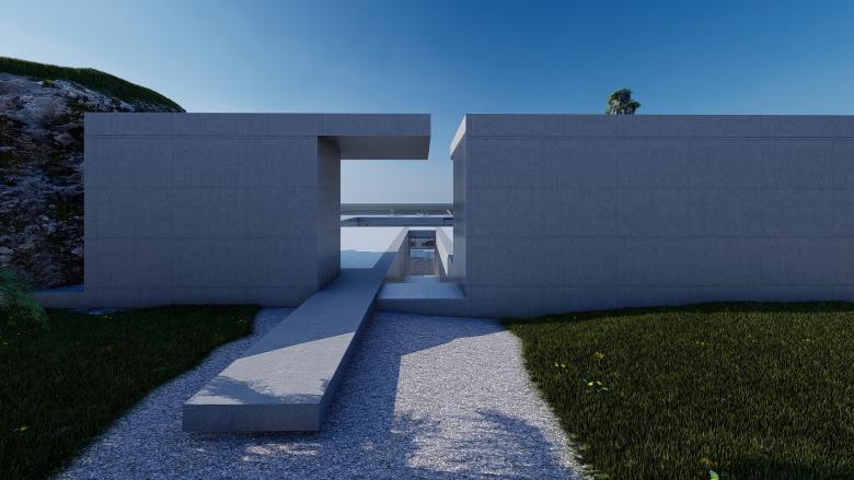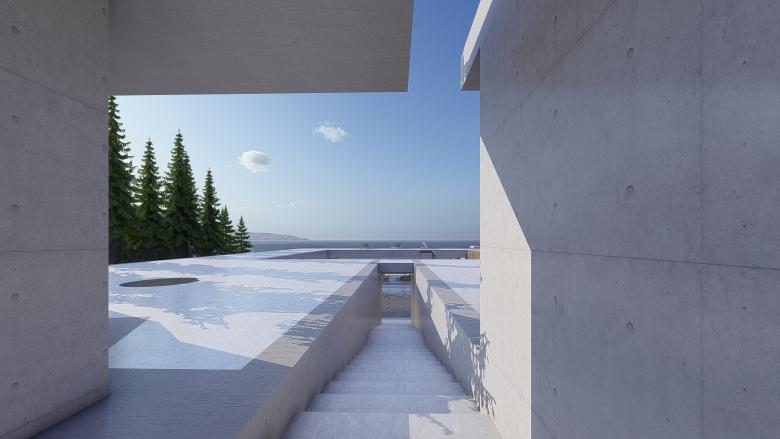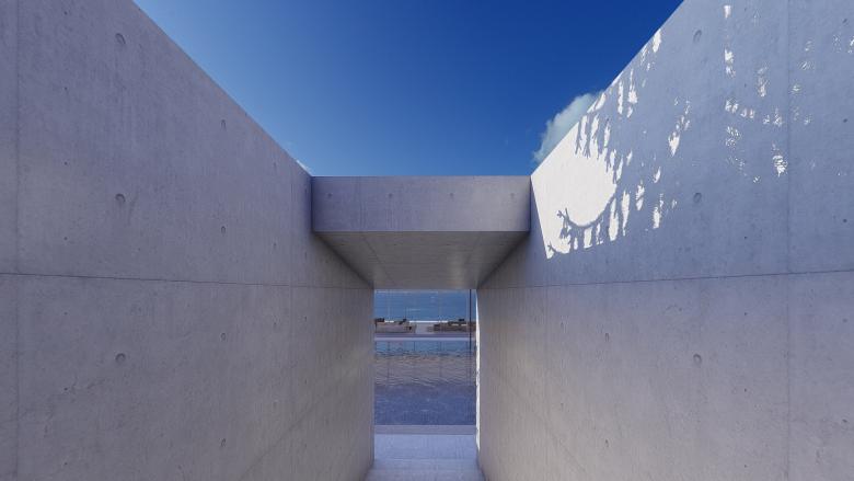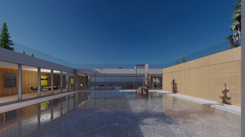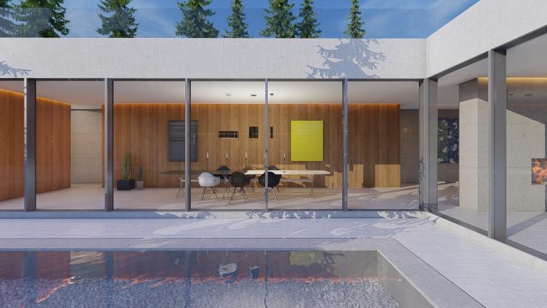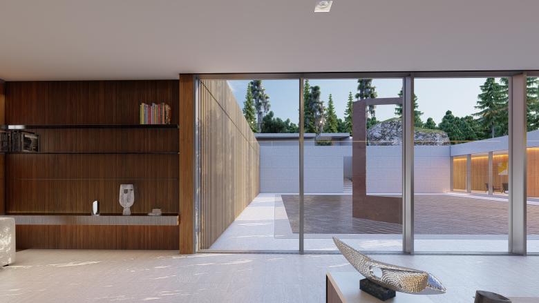 Una Villa interclusa; si apre intorno ad una corte quadrata. Da lì le trasparenze permettono di guardare fuori.