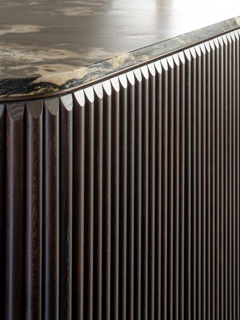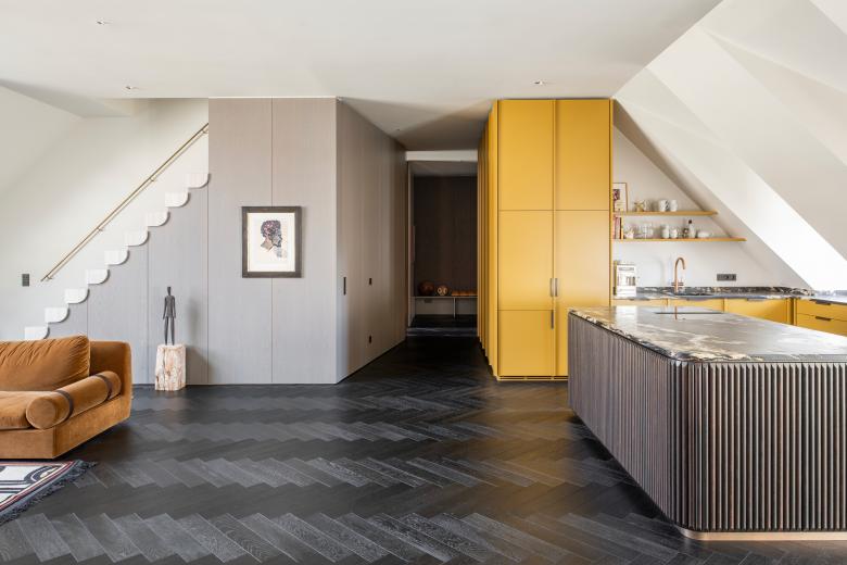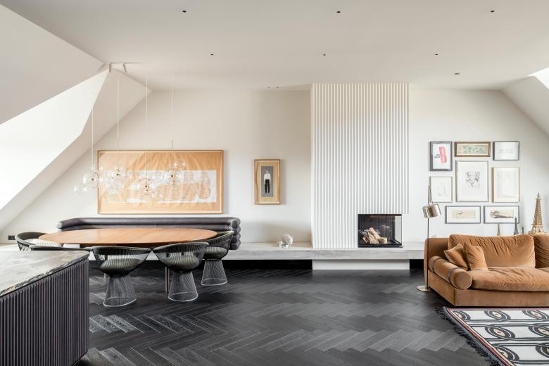 Arnold / Werner verwandelte ein ehemaliges Künstleratelier im Dachgeschoss eines denkmalgeschützten Schwabinger Jugendstilhauses in eine großzügige Wohnlandschaft. Nach einer gründlichen Kernsanierung mit neuer Grundrissaufteilung bildet der lichtdurchflutete Hauptraum mit markantem Atelierfenster den Mittelpunkt der Wohnung. Hier liegt der Wohnbereich mit offener Küche, dessen maßgefertigter Innenausbau eine ebenso klar strukturierte wie sinnliche Farb- und Materialwelt entstehen lässt. Raumprägende Elemente sind insbesondere der Parkettboden aus schwarz gebeizter Eiche sowie die pointierten Akzente ausgesuchter Natursteine: dunkler Quarzit für die Küchenarbeitsflächen, heller Travertin für eine lange Kaminbank und weißer Marmor für die Treppenstufen ins offene Galeriegeschoss des ausgebauten Dachspitzes.