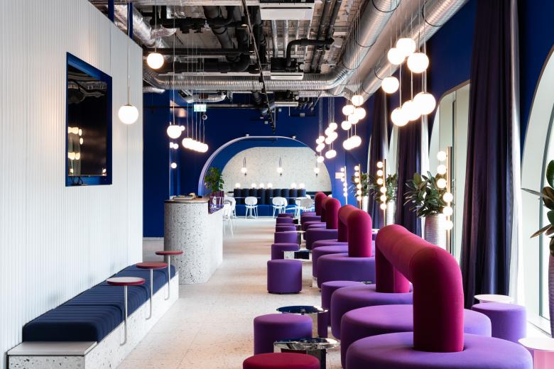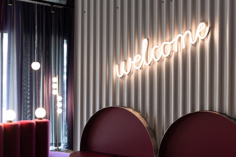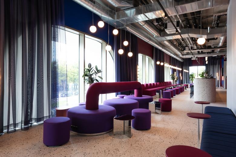 „Munich Disco“, so lautet das für dieses Hotel entwickelte Designmotto, und so treffen die Gäste auf eine farbenfrohe und formverspielte Welt der 1980er- und 90er-Jahre. Weiße Terrazzofliesen sowie vornehmlich in Bordeauxviolett und Ultramarinblau gehaltene Oberflächen bestimmen die öffentlichen Bereiche. Hinzu kommen Neonschriftzüge, Kugelleuchten, sanft geschwungene Theken und eigens entworfene Sitzgruppen aus runden Polsterelementen. In den Zimmern sorgen Teppiche mit Memphis-Mustern sowie abwechselnd rotviolette und nachtblaue Wände und Decken für das in der Glanzzeit der Disko-Musik typische expressiv-minimalistische Erscheinungsbild.