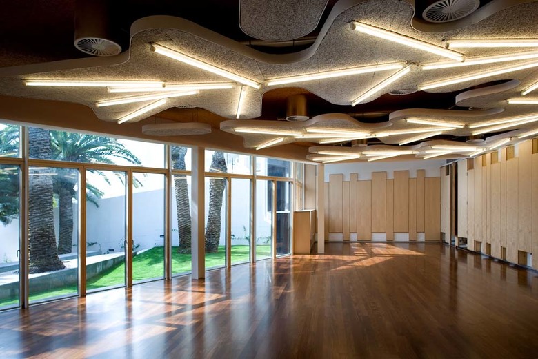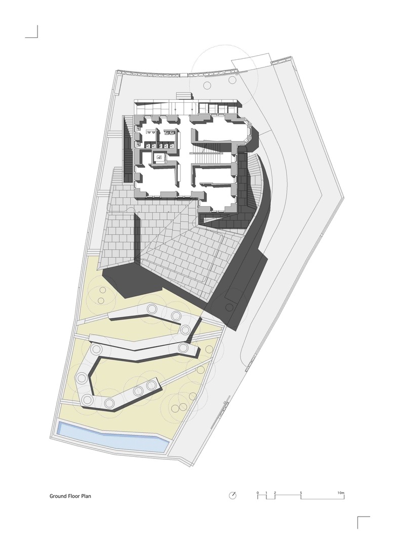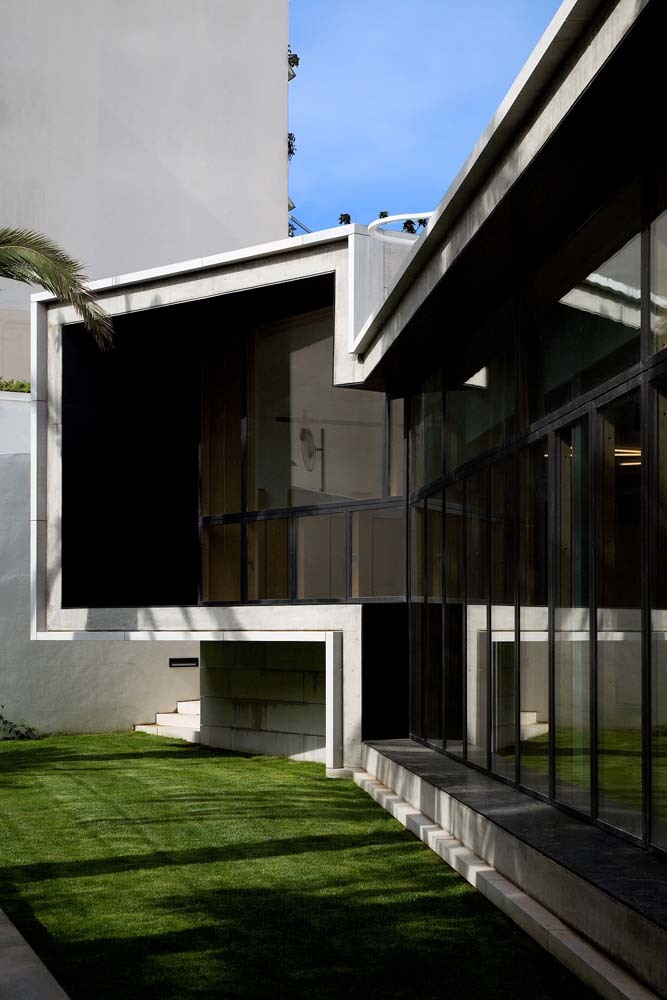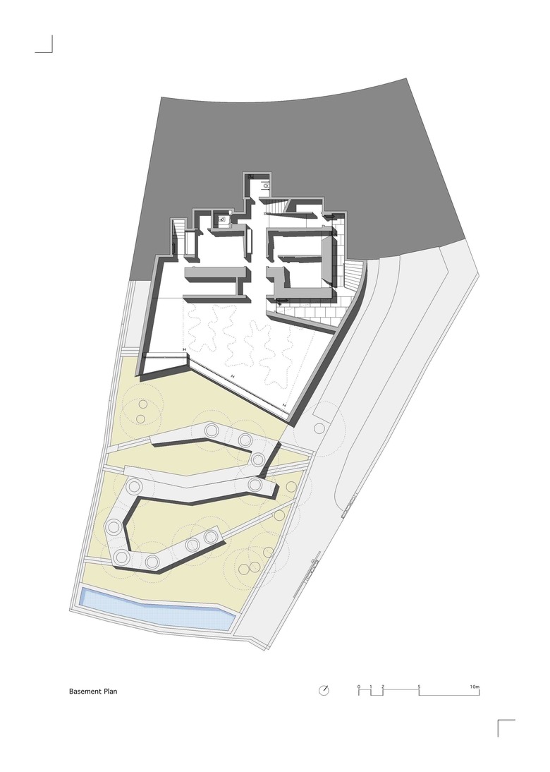 The construction of the new multi-use room, of larger proportions, destined to rehearsals and orchestra concerts, was made by simply extending the stone foundations of the original house to the palm-tree field. Its geometry matches the response to the visual circumstances of the surroundings by framing the environment in an intense relation with the garden. It also secures the specific acoustic demands and allows, at the side of the lot, for the passage of a new street accessing the parking area.