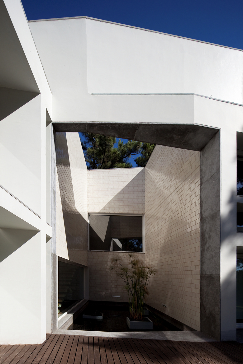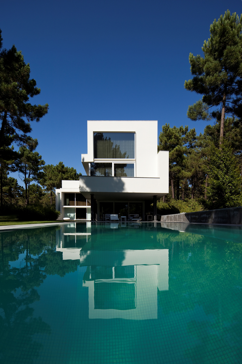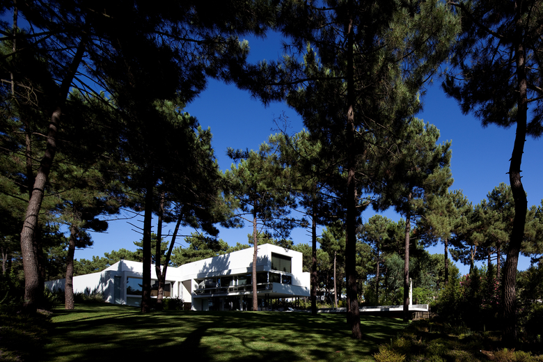 This is the second project for the urbanization of the Aroeira's golf course, a field of lawns, sand zones and lakes, and in this case, also a pine tree area. The terrain is narrow and long, slightly triangulated and with a soft inclination alongside the lot. It is also densely occupied by large pines, which end suddenly at north by the immediate vicinity of the golf course.