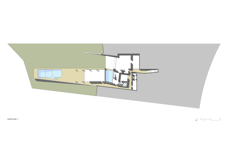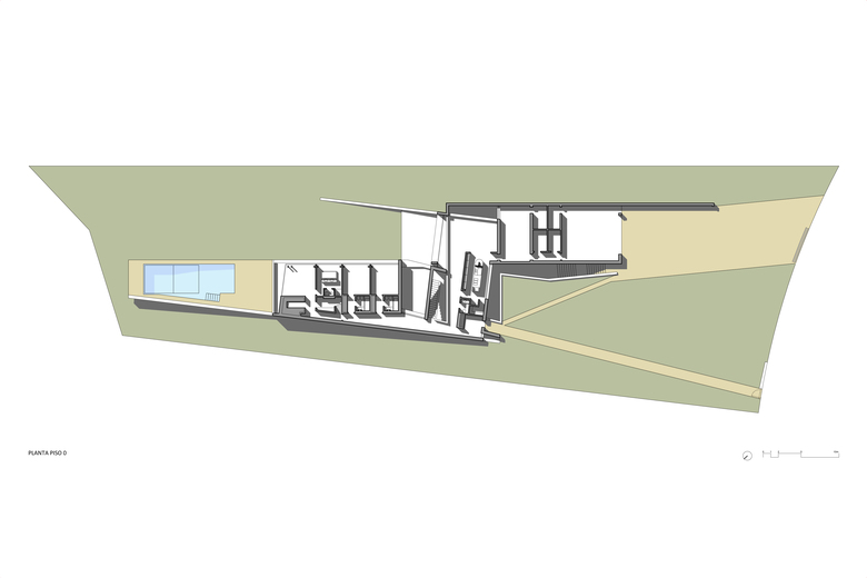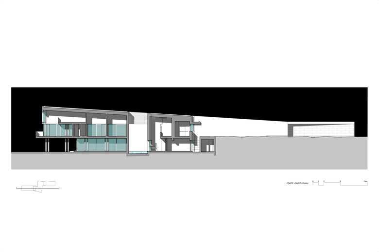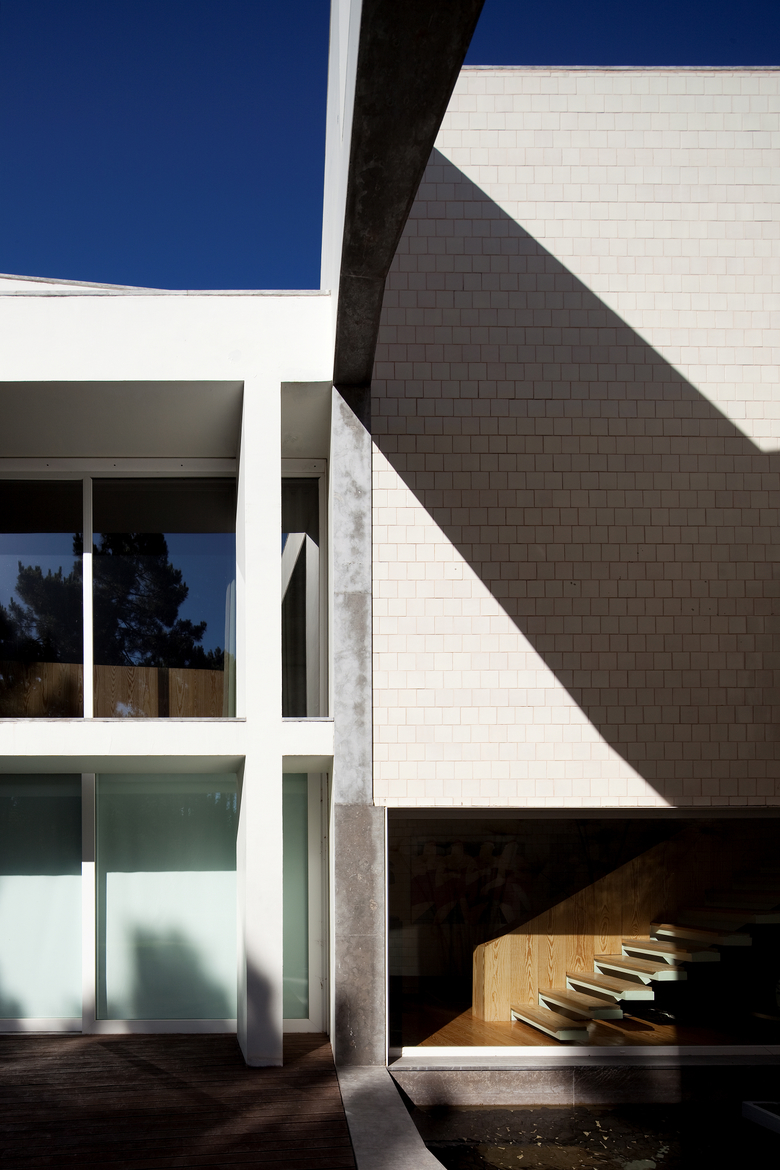 The house consists on three continuous bodies, articulated by two patios. The first body, a ground floor, is longitudinal to the entrance and is used as garage and working area. The second is transversal and comprises the common life of the house, the kitchen and living-rooms, overlapped in two storeys, opening up to the landscape. The last one is once again longitudinal and a one-floor body, now in suspension, and comprises the bedroom area.