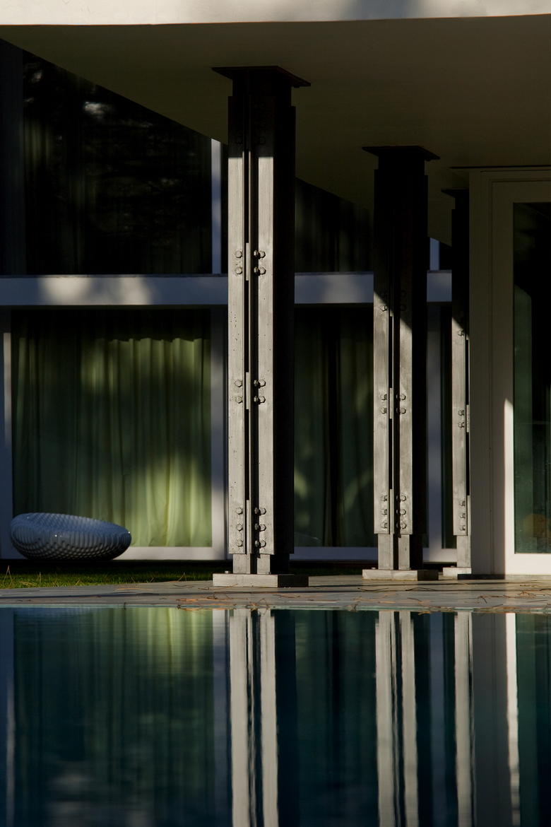 At the same time the natural curve of land goes down, the roof goes up, and the house shifts from a ground-based situation to a floating one, supported by the delicate metal columns and drawing a trail across the garden down to the pool.