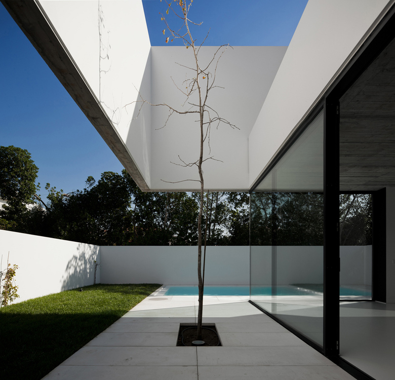 In the concept for this small house in the vicinity of Aldeia de Juso, the tiniest area of flat land and the house’ s, as well as the high density of the new houses yet to be built in the surroundings, forcibly draw us to some sort of “obsession” about the possibilities of dilating space.