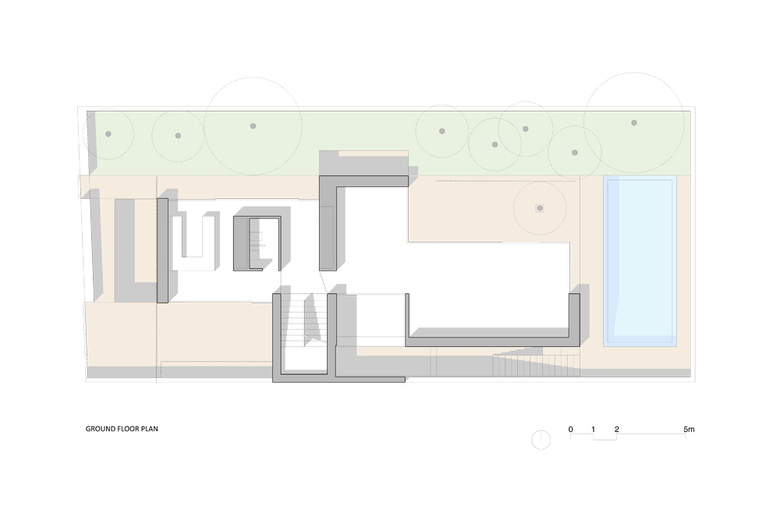 On the ground level, the limits for the “precincts”, appears widened and defined by the walls around the lot. The inner space is freely configured. Consistent with the strategy of maximizing the presence of the gardened outdoor space, the garage is then left aside to an “inserted” area to the south of the kitchen. All the social spaces of the building are located on this floor.