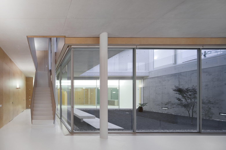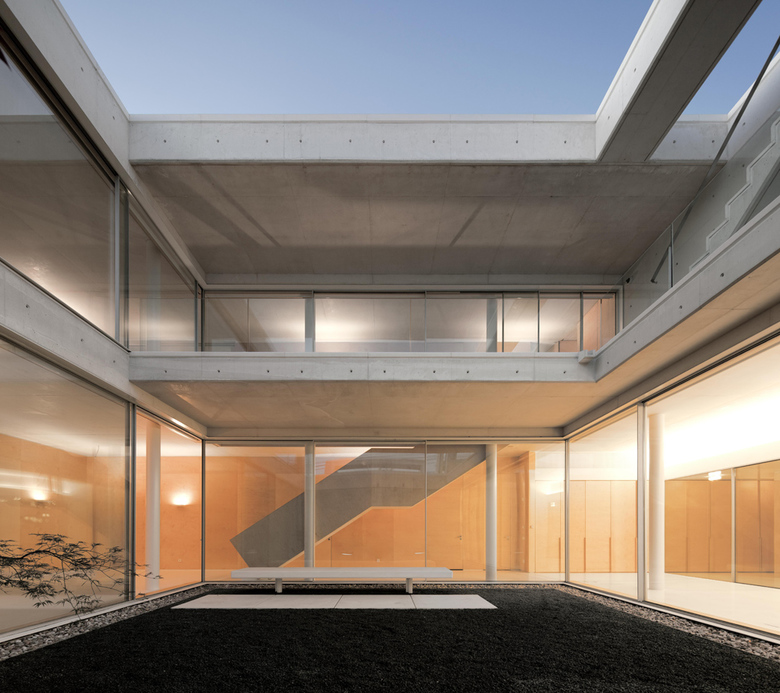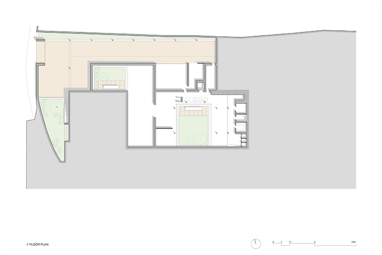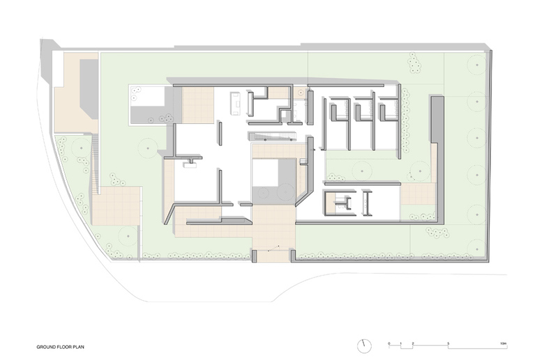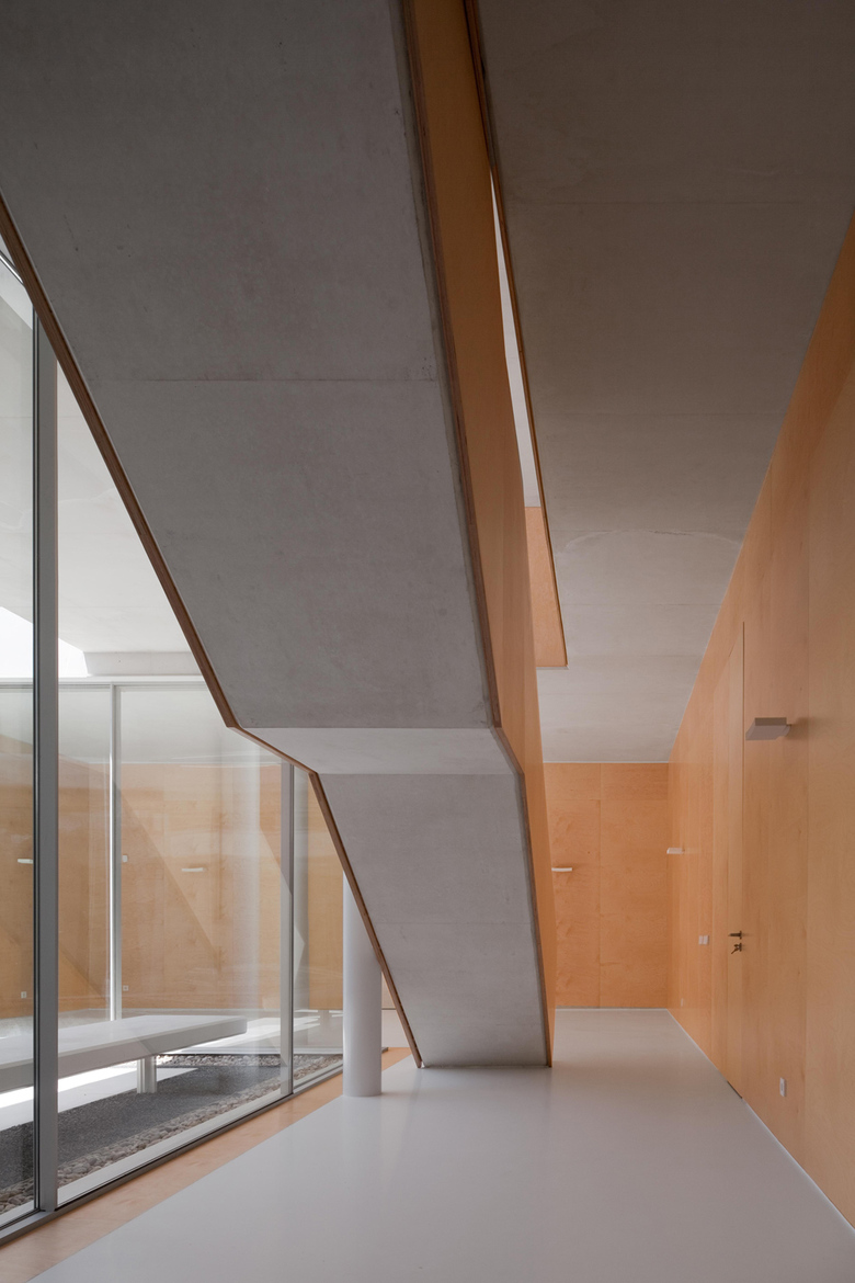 In the lower volume are located the technical areas, the less used areas or those of support. In the upper volume the socials áreas gather around a main courtyard, and the bedrooms around a private second one.
