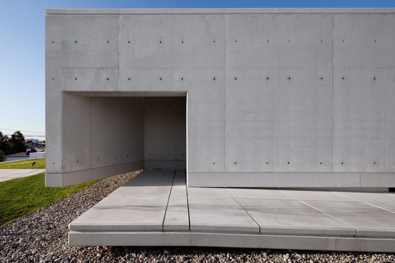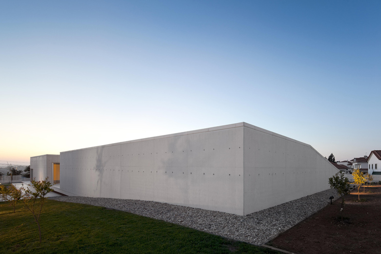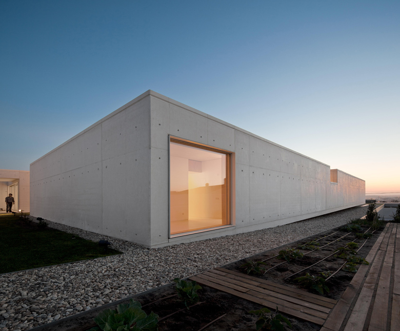The conception of the house emerges directly from the way we observed this reality. Dealing with a single-family house of large dimensions for local standards, we chose to divide the construction volume in two parts. Half of the construction is buried, like a negative of the land, and assumed as being a part of it. Over that half-land, a second volume is placed, long and flattened, in apparent white concrete.