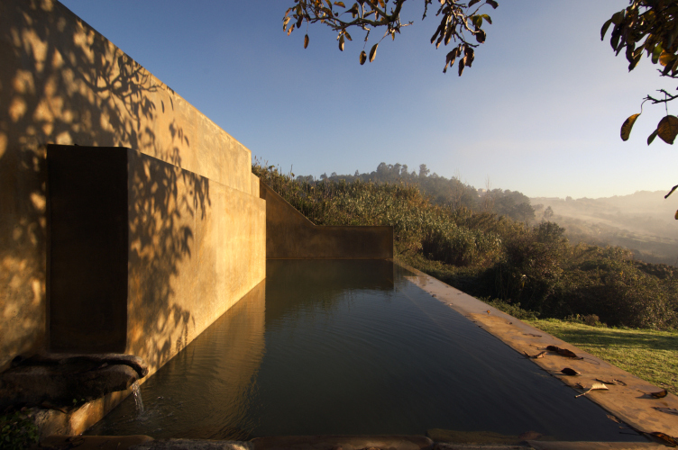 It is a steep slope facing south over the valley, furrowed by a small river and a mountain in the background. While the upper half of the site is ramped, the lower is built in steps. In the transition between both two clear references became the starting point for the project: a walnut tree and a watering tank.