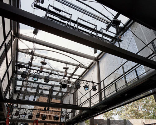 The structure’s lower half is a present-day version of the Mediterranean loggia, an open space that can easily be configured to accommodate the Lab’s various programs. The upper part of the structure houses a flexible rigging system and is wrapped in a semitransparent mesh. Through this external skin, visitors are able to catch glimpses of the extensive apparatus of “tools” that may be lowered or raised from the canopy according to the Lab’s programming needs, transforming the ground space into a formal lecture setting, a stage for a celebratory gathering, or a workshop with tables for hands-on experiments.