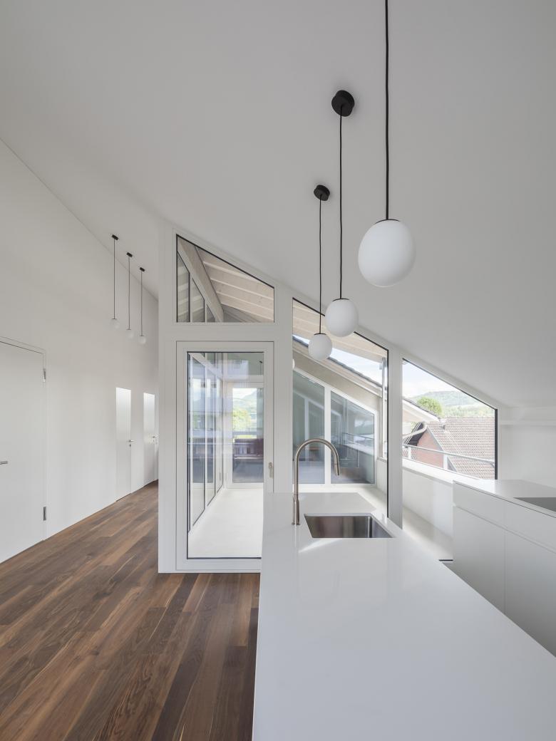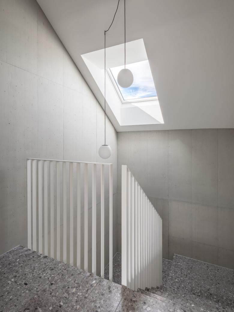Der Neubau wird in Massivbauweise umhüllt von einem mineralisch eingefärbten Kratzputz erstellt. Sichtbare Stützen und das raumbildende Vordach im Erdgeschoss sind in Sichtbeton ausgeführt. Das einstehende Eingangsgeschoss mit Zugang setzt sich farblich ab und zeichnet so den Bezug zur Nutzung. Das auskragende Satteldach faltet sich leicht über das Wohnhaus und öffnet sich über der Loggia.